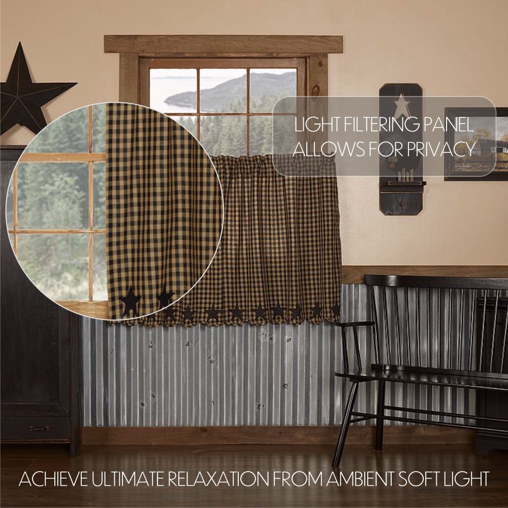 Dark khaki tan and raven black checkered plaid add a relaxed, primitive feel to your windows. Our Black Star Scalloped Tier Set measures 36x36 inches and includes a softly scalloped edge accented by applique stars. The rustic country pair of short, tier-style curtains is constructed with 100 percent cotton for easy care and is machine washable and iron safe. The curtains are fully lined with a soft white fabric to offer increased protection from the sun and fading. Includes a 3.25 inch rod pocket for easy hanging.