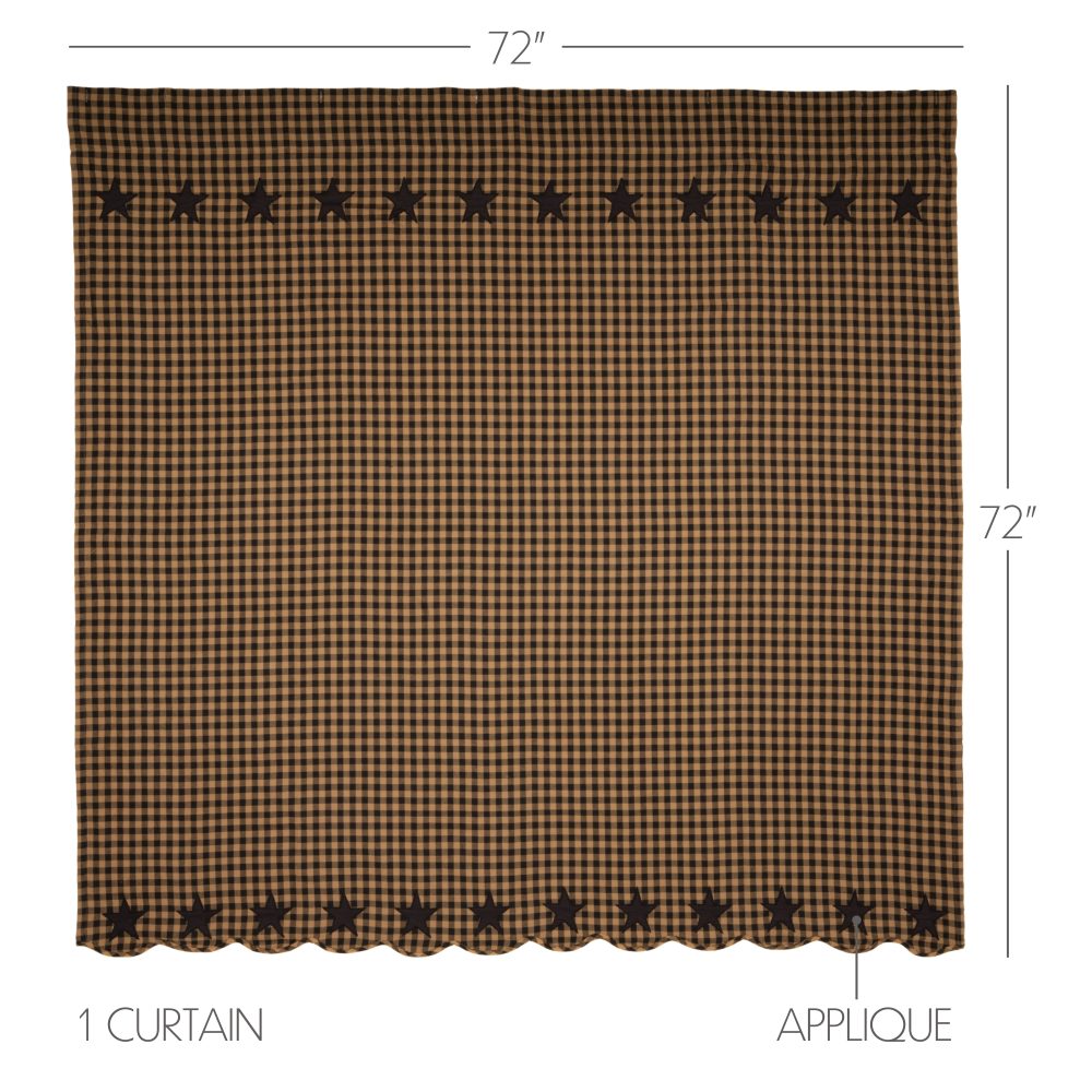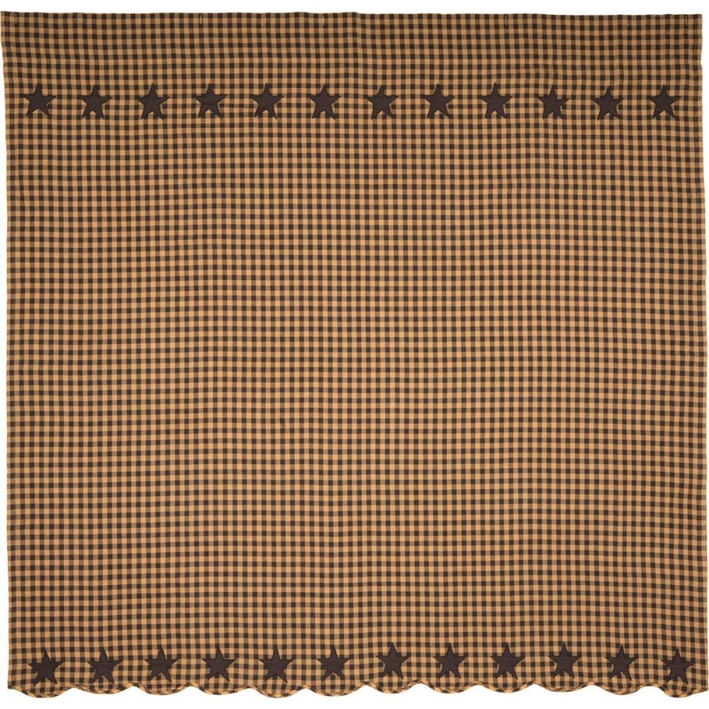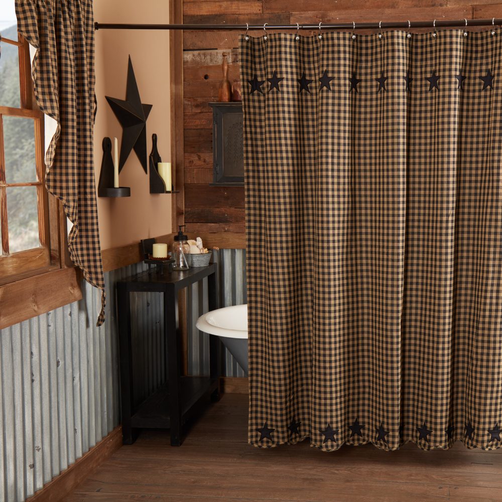 Decorate your bathroom with the perfect blend of simplicity and country charm with the Black Star Shower Curtain. Featuring large scale black and tan checks beautifully accented with a row of applique stars, our 72x72 fabric shower curtain provides a modern primitive touch to your bathroom decor. This machine washable, 100% cotton shower curtain includes button holes for shower hooks and a rod pocket for versatility and convenience.