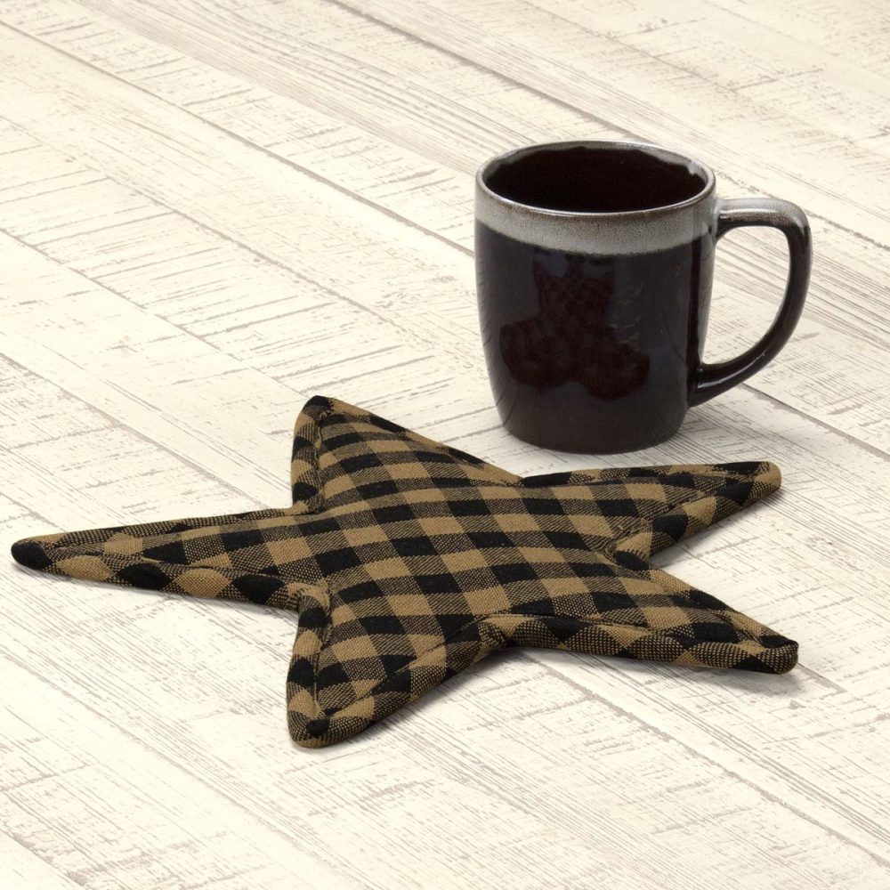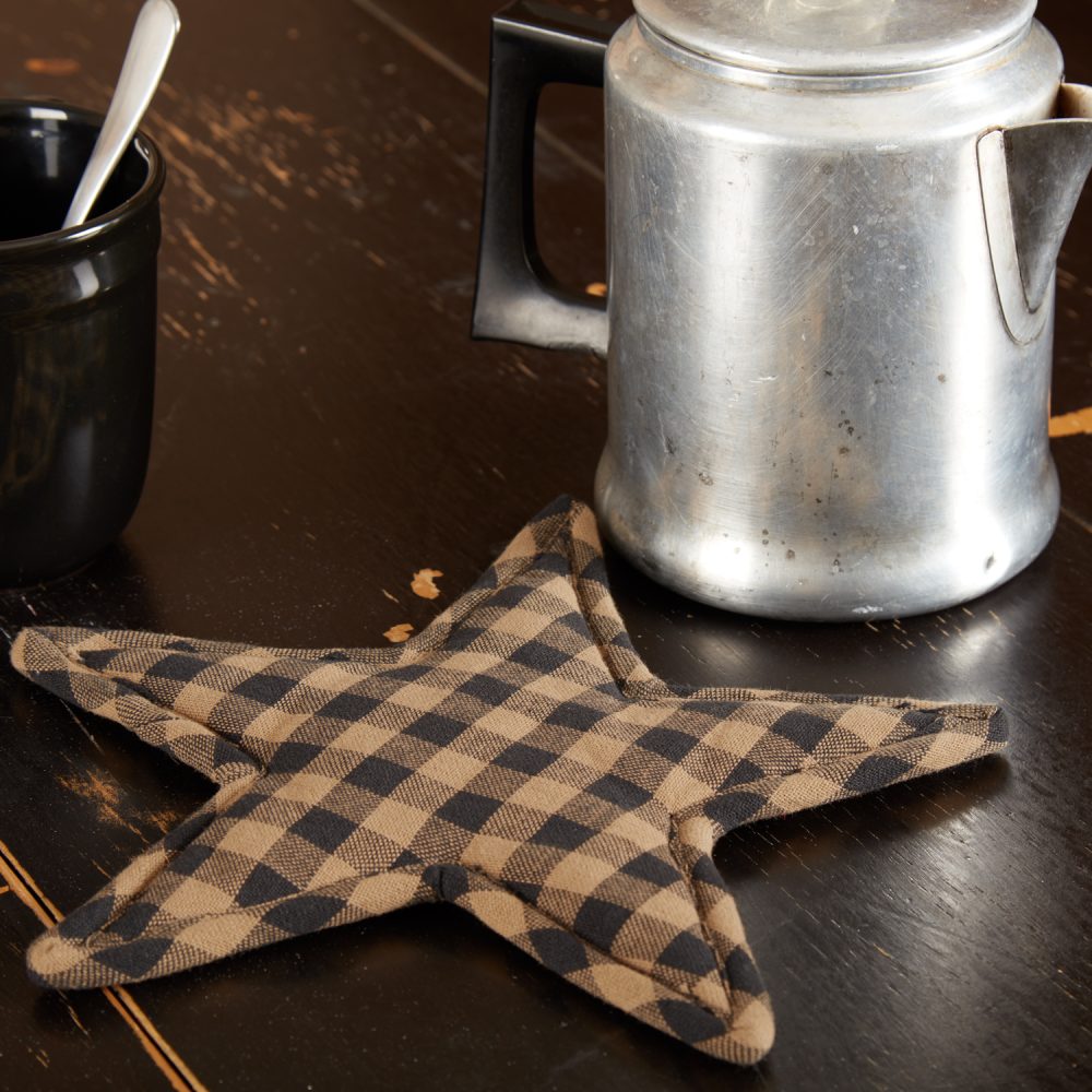 Who says trivets have to be boring? Protect counters and tables from hot pans and dishes with vintage color and a whimsical, primitive shape. The Black Star Trivet includes one star-shaped trivet with a 10-inch diameter made from 100 percent cotton. The five-point star shape adds a touch of country style while the black and tan checked plaid adds a vintage feel you'll love. Complete your tabletop decor with other pieces from the Black Star Collection by VHC for modern primitive style.