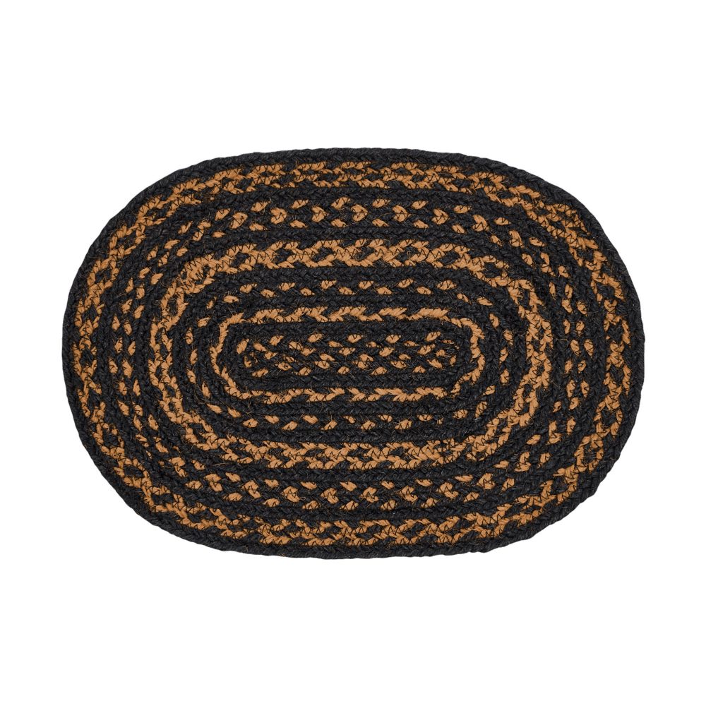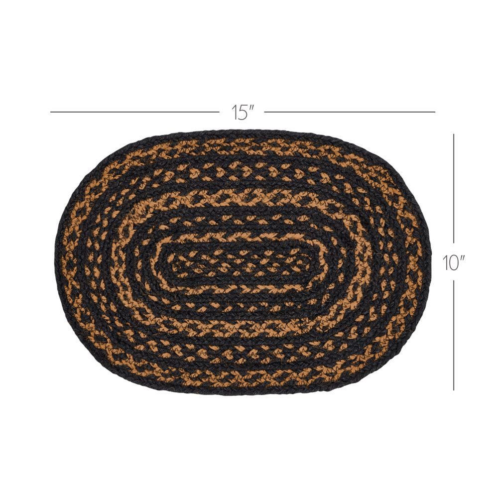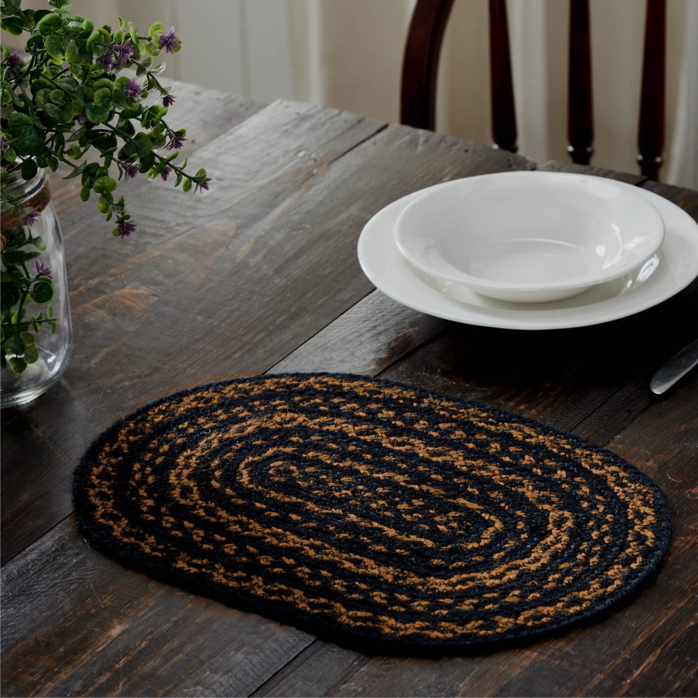 Create a warm, traditional table for friends and family to gather round with deep, primitive color and classic texture. The Black & Tan Jute Placemat includes an individual oval placemat measuring 10x15 inches made from a premium Jute blend. The rich texture of braided jute is given a rustic feel with country black and dark tan tones in alternating rows for traditional country style. Complete your tabletop decor with other pieces from the Black & Tan Collection by VHC for vintage farmhouse style.