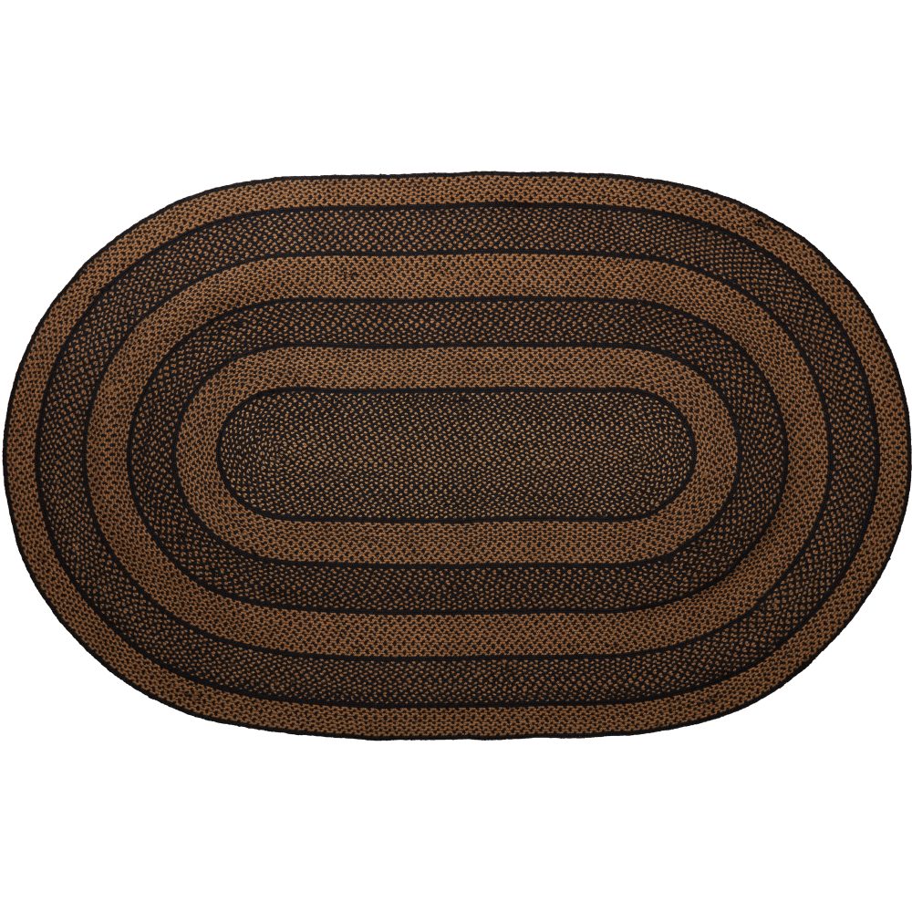 Create a warm, homey feeling with deep primitive colors in a curl-resistant jute blend that adds style and safety anywhere a versatile area rug is needed. The Black & Tan Jute Rug measures 60x96 inches and features a classic oval shape and tight braids constructed with a durable jute blend. The special blend relaxes faster and stays flat. The included PVC mat makes sure your beautifully braided jute rug stays exactly where it should. Features a blend of country black and dark tan for a dark, rustic look that complements a wide array of country farmhouse decor.