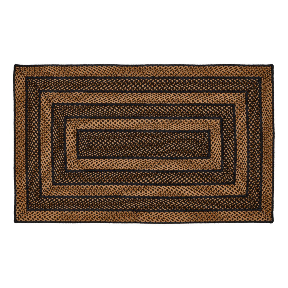 Create a warm, homey feeling with deep primitive colors in a curl-resistant jute blend that adds style and safety anywhere a large accent rug is needed. The Black & Tan Jute Rug measures 36x60 inches and features a classic rectangle shape and tight braids constructed with a durable jute blend. The special blend relaxes faster and stays flat. The included PVC mat makes sure your beautifully braided jute rug stays exactly where it should. Features a blend of country black and dark tan for a dark, rustic look that complements a wide array of country farmhouse decor.