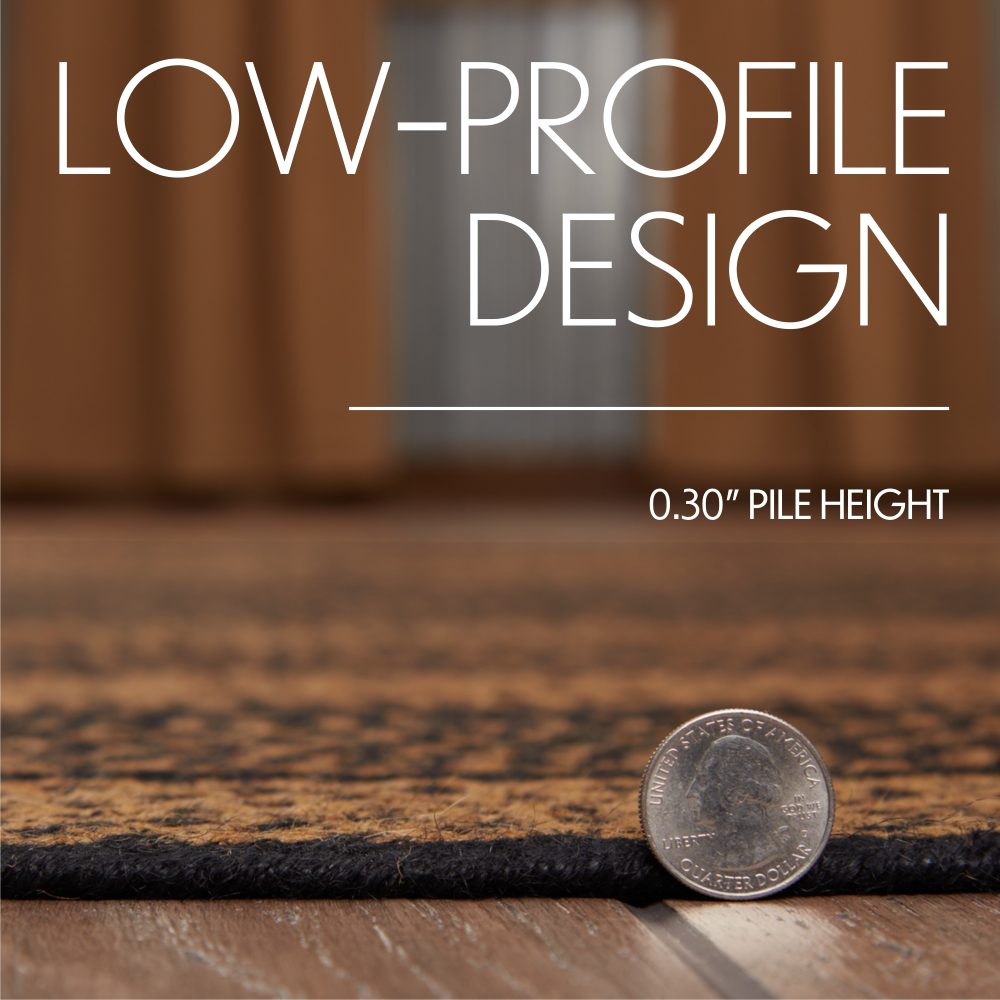 Create a warm, homey feeling in your hallway with deep primitive colors in a curl-resistant jute blend that adds style and safety. The Black & Tan Jute Runner measures 24x78 inches and features a classic rectangle shape and tight braids constructed with a durable jute blend. The special blend relaxes faster and stays flat. The included PVC mat makes sure your beautifully braided jute rug stays exactly where it should. Features a blend of country black and dark tan for a dark, rustic look that complements a wide array of country farmhouse decor.