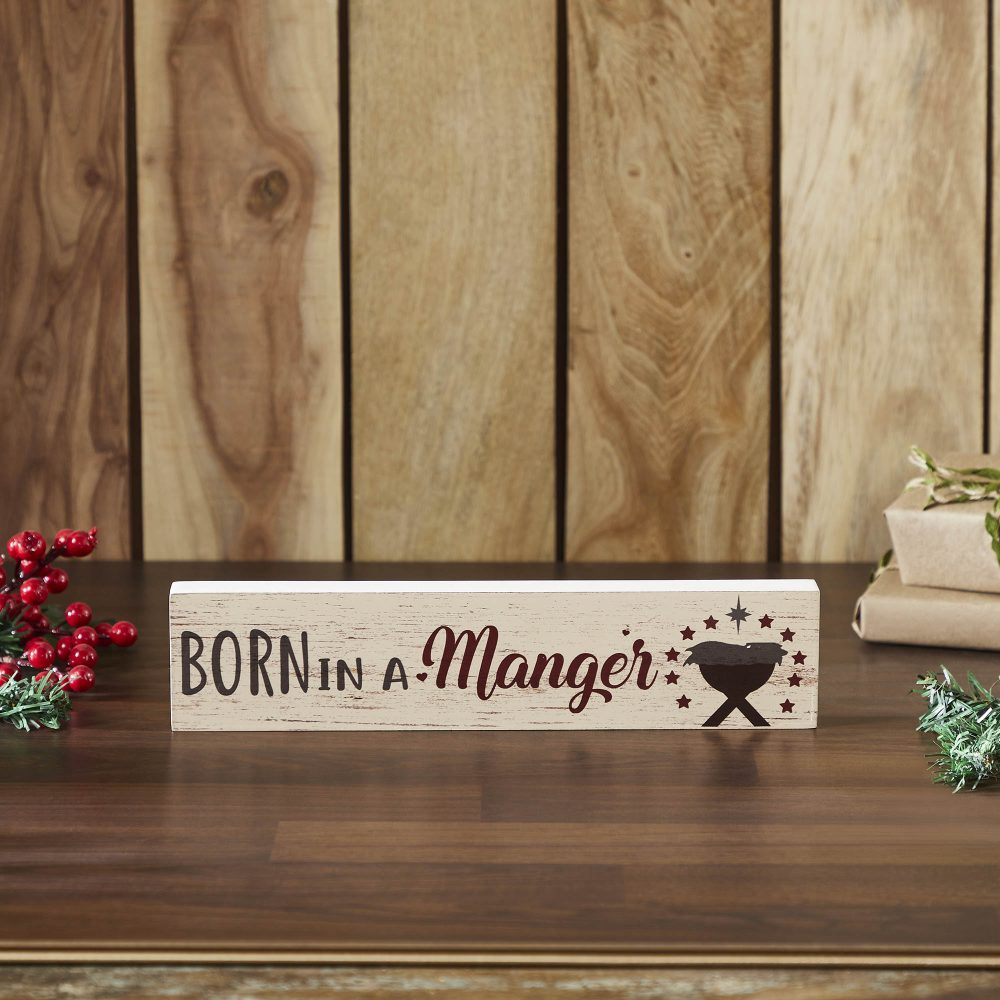 - Add a rustic charm to your Christmas decor with this tabletop block sign, measuring 3×13 inches, featuring the timeless message “Born in a Manger” in classic text.