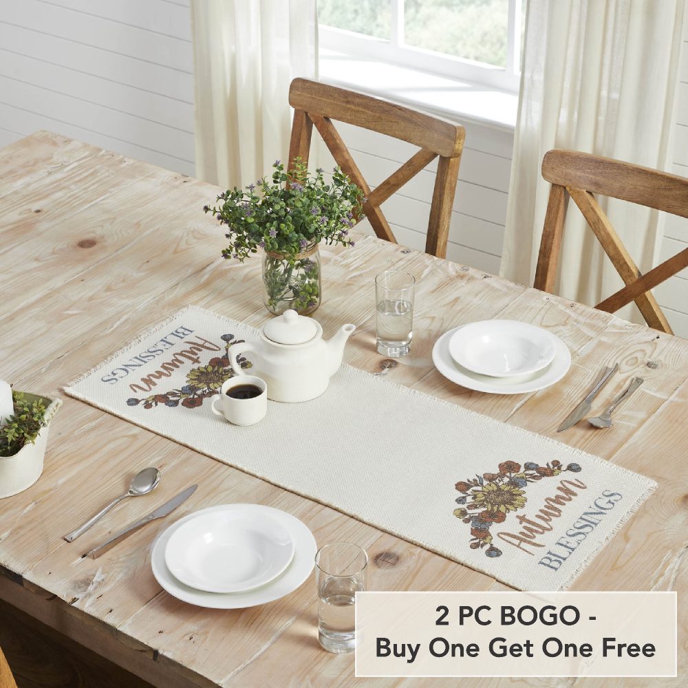 - Sku – 84062 – Bountifall Autumn Blessings Decorative Table Runner 12×36 Inch Fall Harvest Thanksgiving Home Decor Fabric Accent (2 Packages)