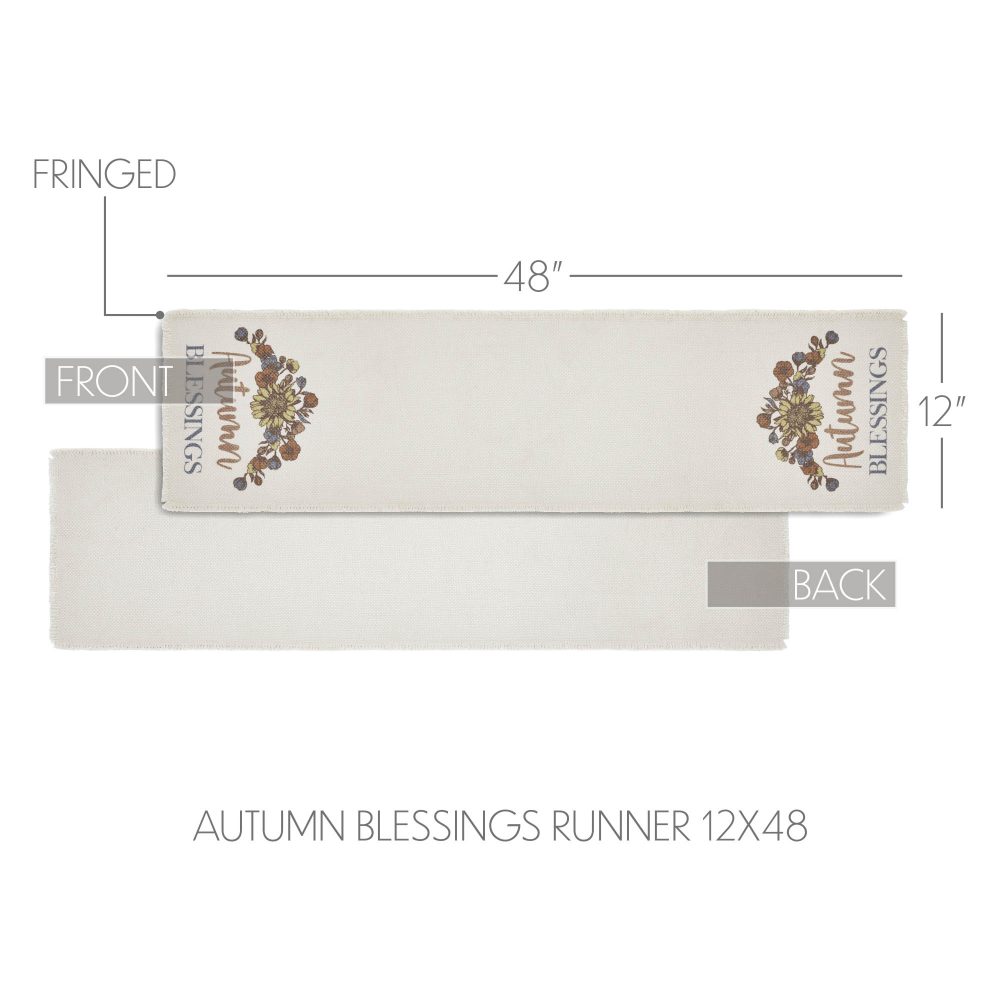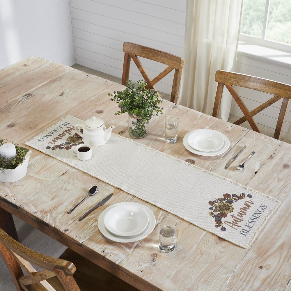 - PREMIUM FALL HARVEST DECOR: Elevate your seasonal dining experience with the VHC Brands Bountifall Autumn Blessings Fall Harvest Table Runner, precisely sized at 12×48 inches. This exquisite piece is expertly crafted from a durable, eco-conscious recycled textile base, featuring delicate fringed edging for rustic charm, an intricate vintage-inspired floral pattern, and “Autumn Blessings” word art, creating a heartwarming and stylish centerpiece perfect for Thanksgiving and farmhouse-themed kitchen or dining spaces.