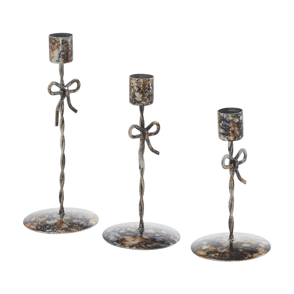 Add antique elegance and rustic charm to your holiday decor with the VHC Brands Bow Candlestick Holders Burnished Metal Set of 3. Made from durable iron, each slender taper candle holder features a gracefully spun wire stem and a decorative bow, creating a delicate yet sturdy design. The set includes three sizes-5.25, 6.25, and 7.5 inches-perfect for creating a layered display on mantels, tables, or shelves. Finished in a mottled mix of aged black, tarnished silver, and dark gold, these electroplated holders boast a distressed, burnished appearance that evokes a timeworn, primitive style. The subtle metallic tones and weathered textures add depth and warmth, making them ideal accents for both festive and everyday settings. Whether illuminated or left unlit, they bring a soft, vintage glow to your seasonal arrangements. Suitable for use in the bathroom, bedroom, dining room, entryway, kitchen, or living room, this set of candle holders blends seamlessly with rustic, farmhouse, or antique-inspired interiors. Their unique design and varying heights add visual interest to any vignette. To preserve their finish and charm, simply wipe clean with a soft cloth as needed.