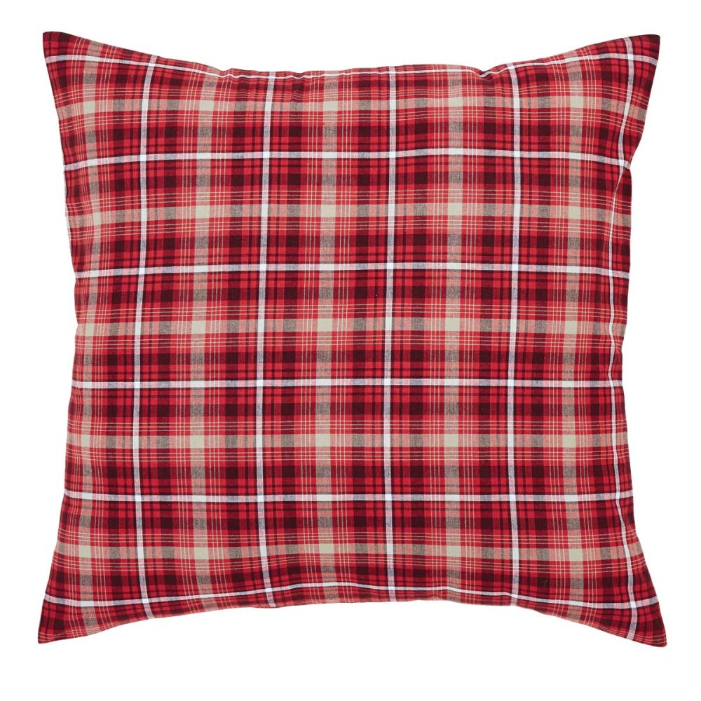 Bring cheer to your classic country decor with rich tones of apple red and deep navy blue with tan accents. The Braxton Euro Sham measures 26x26 inches and features a traditional tartan plaid pattern with a cheerful Americana feel. Add it to bedding, couches or chairs for warmth and style that transforms your space with a relaxed, timeless country look. Machine washable and iron safe. Includes button-style closures for easy removal. Does not include fill pillow.