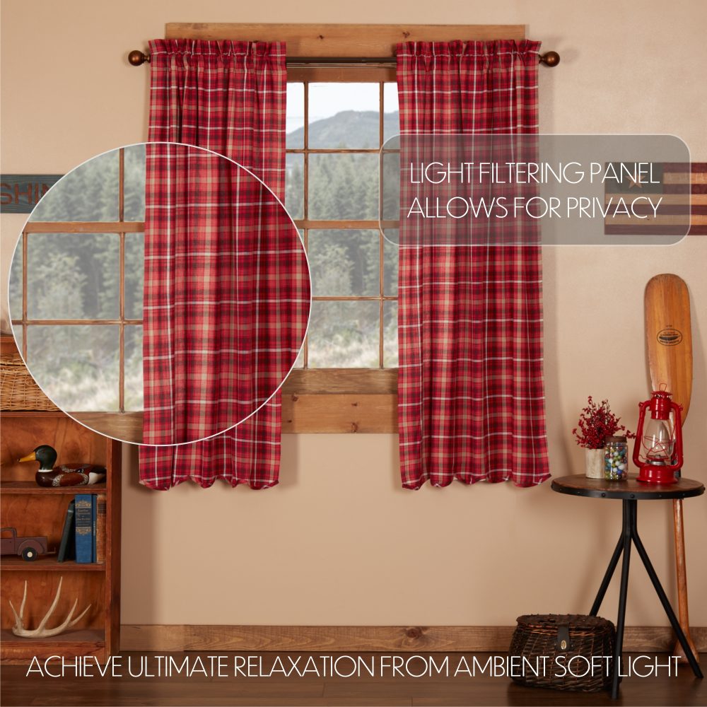 Decorate your windows with a touch of bright, traditional country style with this charmingly designed and thoughtfully crafted window panel set. Displaying a timeless country look with a cheerful, classic tartan plaid in apple red, tan and ebony with scalloped edging, the Braxton Scalloped Short Panel Set 63x36 enhances your home decor with a modern country feel. This 100% cotton curtain set includes two panels with a white lining to prevent fading and provide additional privacy. It includes a rod pocket for easy hanging.