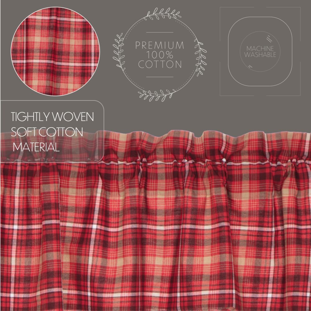 Embracing traditional American plaid, the Braxton Scalloped Window Tier Set inspires primitive and rustic Americana looks with its apple red, tan, ebony black color on soft, 100% cotton fabric. The scalloped edge lends a soft feel, while the rich red apple hue of these 24x36 short, tier-style curtains brings warmth to your kitchen and dining room. The white cotton lining on the back of our curtains helps filter light and a rod pocket makes hanging convenient and easy.