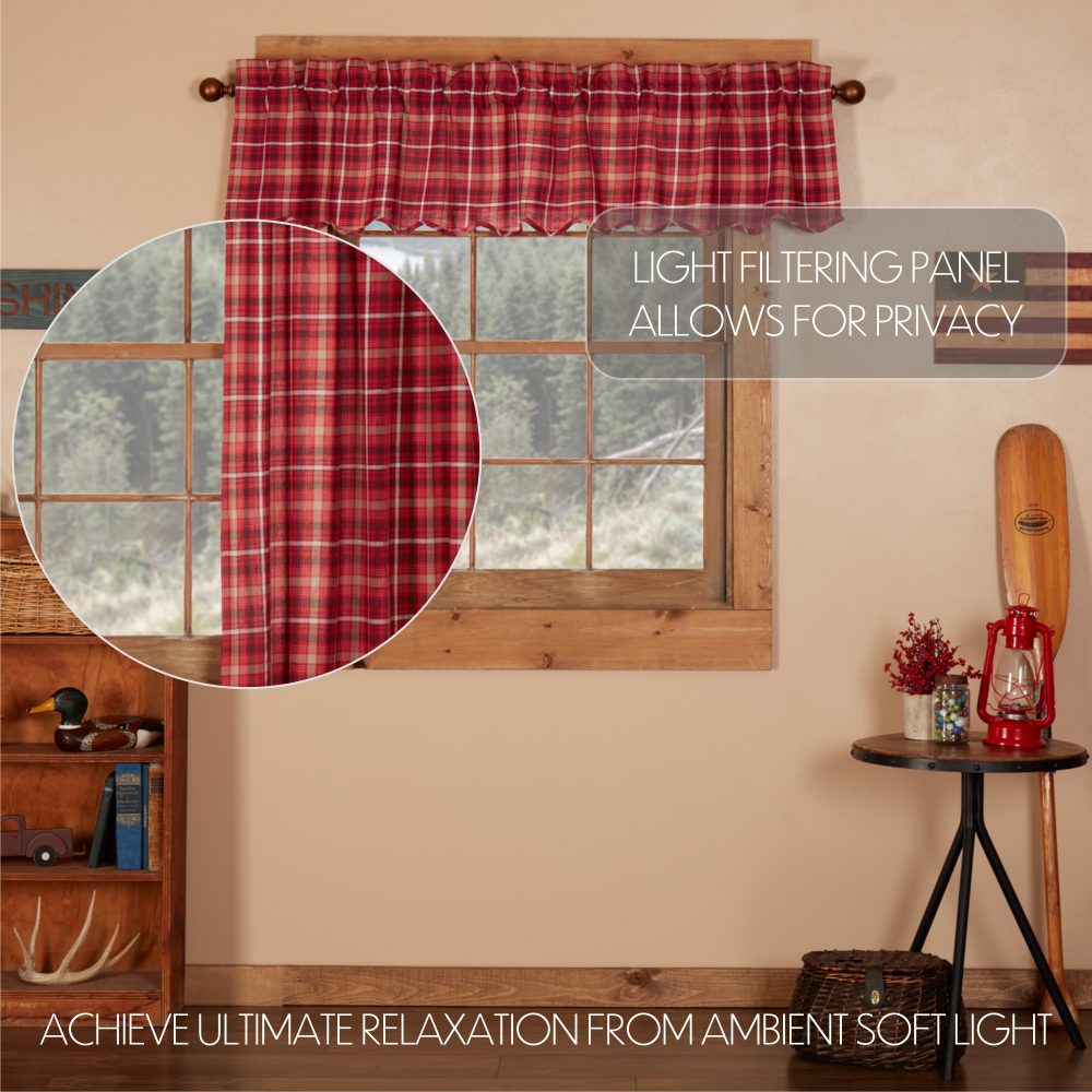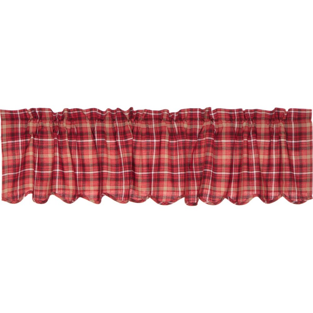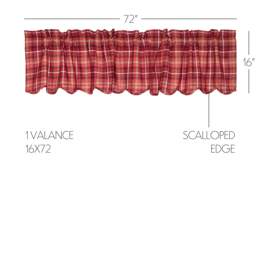 Embracing traditional American plaid, the Braxton Scalloped Window Valance inspires primitive and rustic Americana looks with its apple red, tan, ebony black color on soft, 100% cotton fabric. The scalloped edge lends a soft feel, while the rich red apple hue of these 16x72 valances for windows brings warmth to your kitchen and dining room. The white cotton lining on the back of our curtains helps filter light and a rod pocket makes hanging convenient and easy.