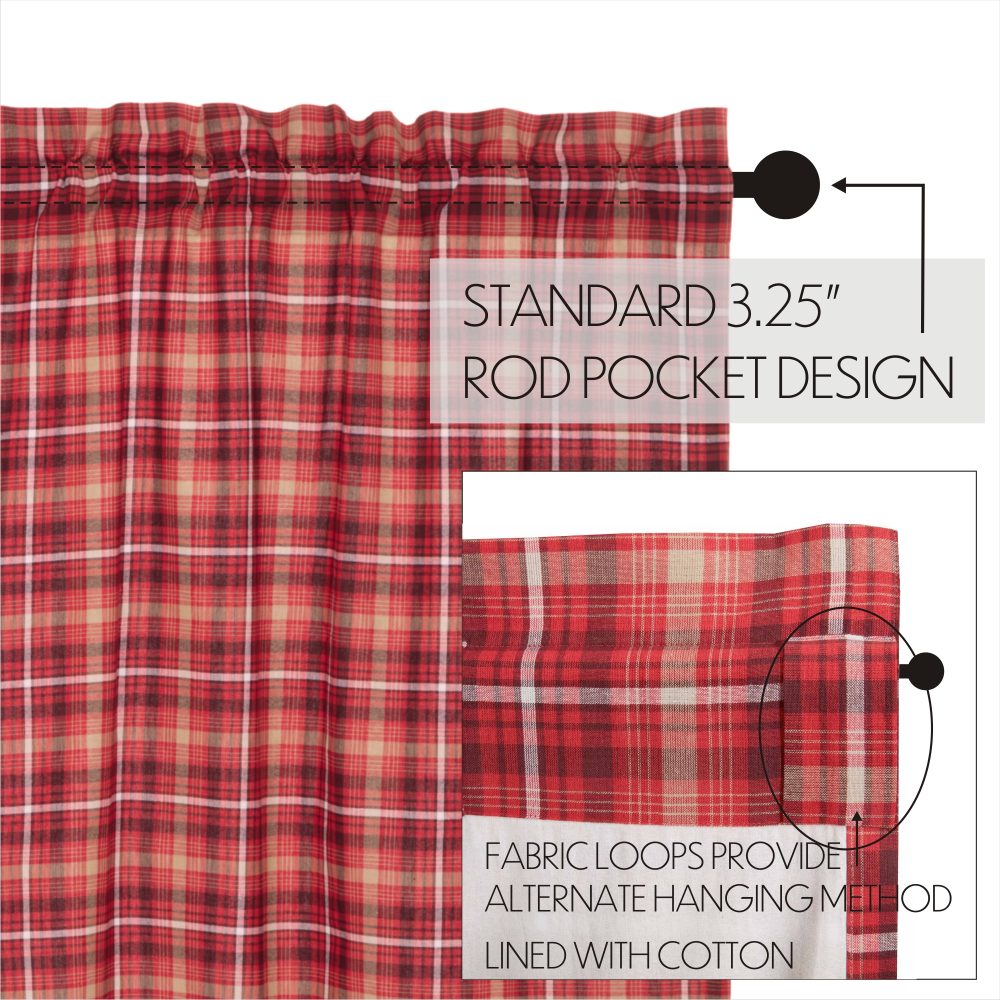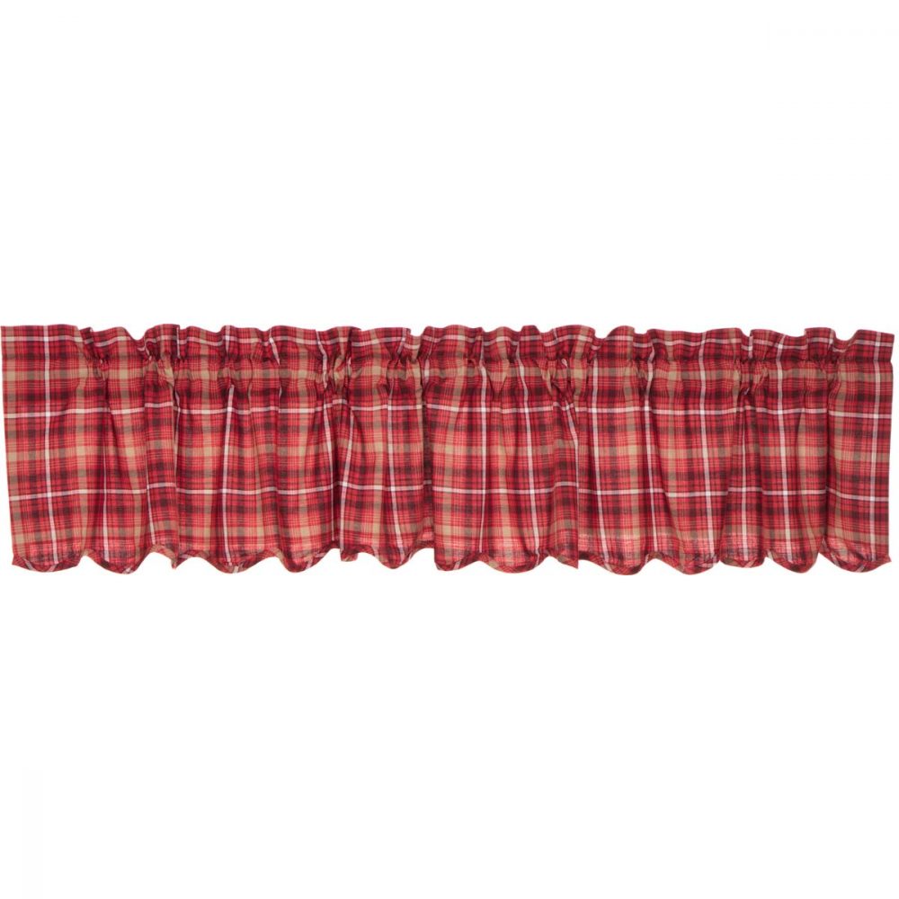 Embracing traditional American plaid, the Braxton Scalloped Window Valance inspires primitive and rustic Americana looks with its apple red, tan, and ebony black color on soft, 100% cotton fabric. The scalloped edge lends a soft feel, while the rich red apple hue of these 16x90 valances for windows brings warmth to your kitchen and dining room. The white cotton lining on the back of our curtains helps filter light and a rod pocket makes hanging convenient and easy.
