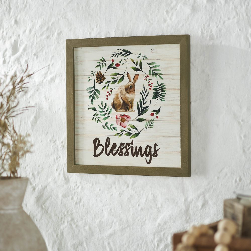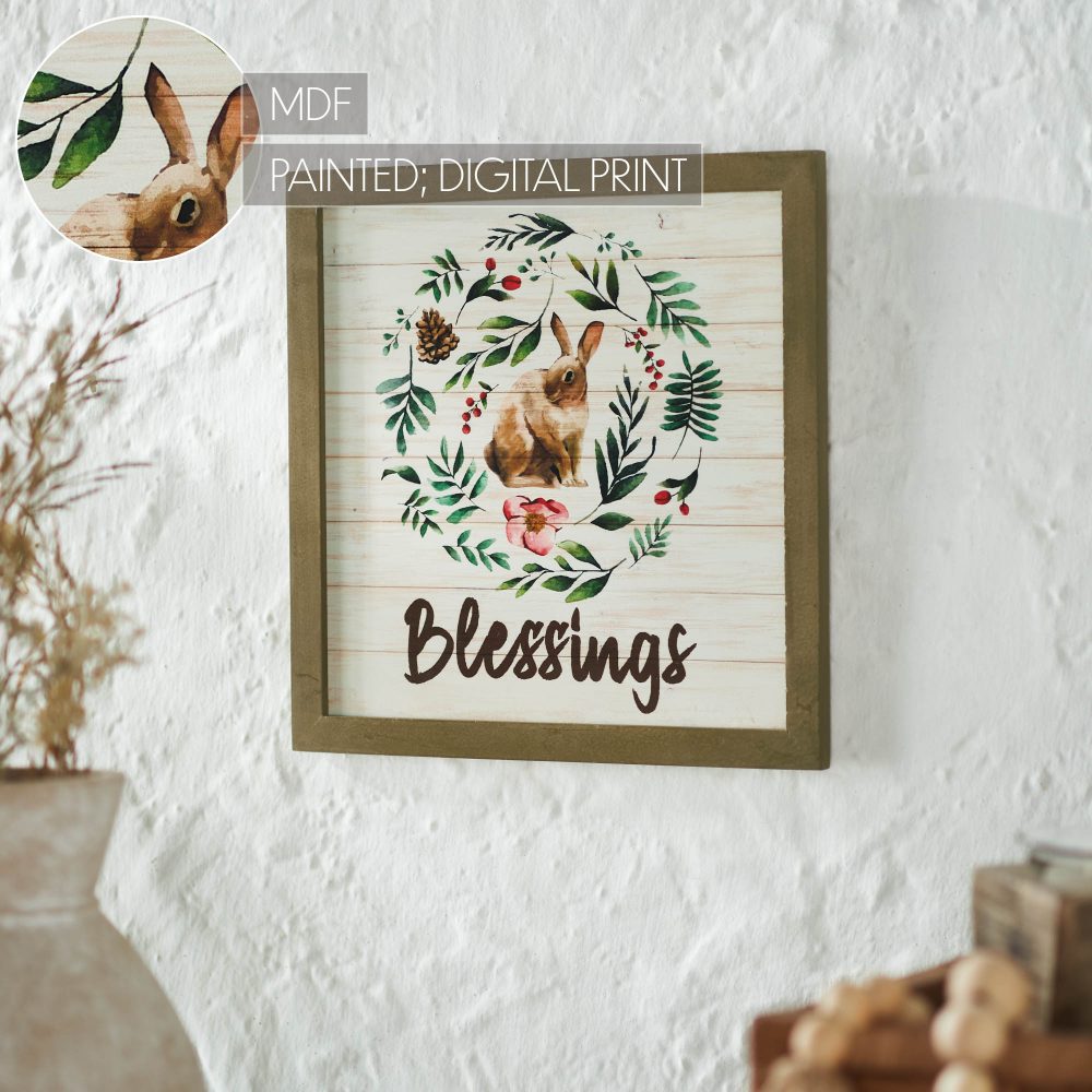 - Charming Design: Features a sitting bunny surrounded by a lush green frond wreath, with the word “Blessings” elegantly displayed in brown at the base.