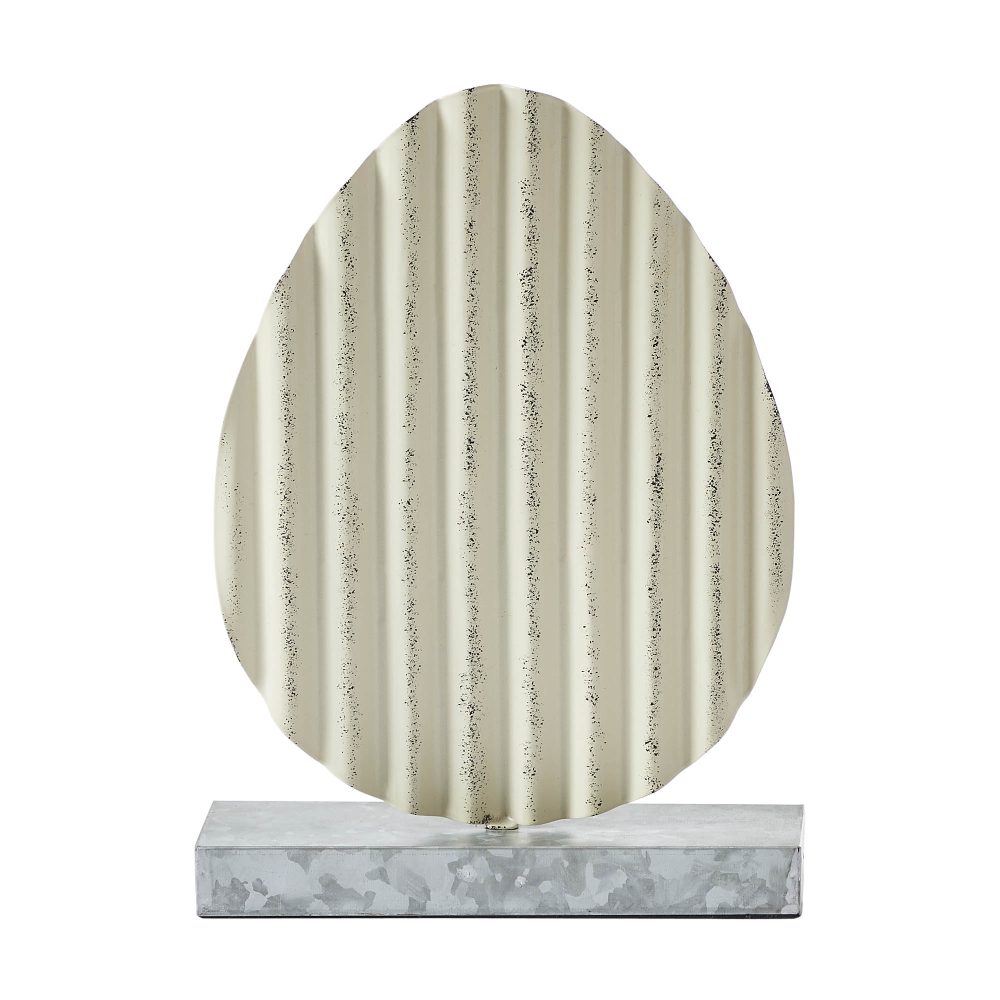 Elevate your spring and Easter decor with the VHC Brands Bunny Hop Corrugated Metal Egg. This charming figurine features a corrugated metal egg with a sophisticated aged ivory finish, adding a rustic and primitive touch to any space. The egg stands elegantly on a galvanized grey metal base, creating a striking contrast and enhancing its vintage appeal. Measuring 8x11 inches, this decorative piece is versatile enough to complement various settings, whether displayed in your bathroom, bedroom, dining room, entryway, kitchen, or living room. The solid color design and corrugated texture provide a unique, eye-catching element that seamlessly integrates into both modern and traditional decor styles. To maintain its pristine appearance, simply wipe the metal surface clean with a soft cloth. The combination of aged ivory and galvanized grey offers a refined country charm that perfectly captures the essence of spring. Add this rustic egg to your home decor collection and enjoy its timeless elegance throughout the season.