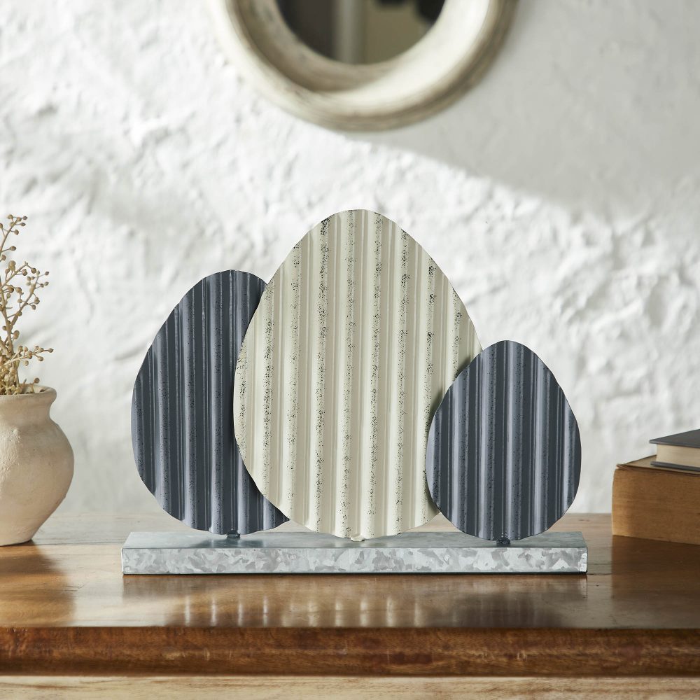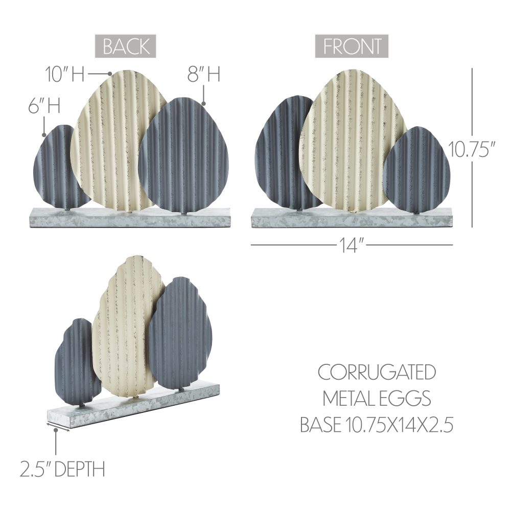 - Charming Trio: Features three sizes of corrugated metal eggs in aged ivory and grey, offering a layered look for a dynamic display.