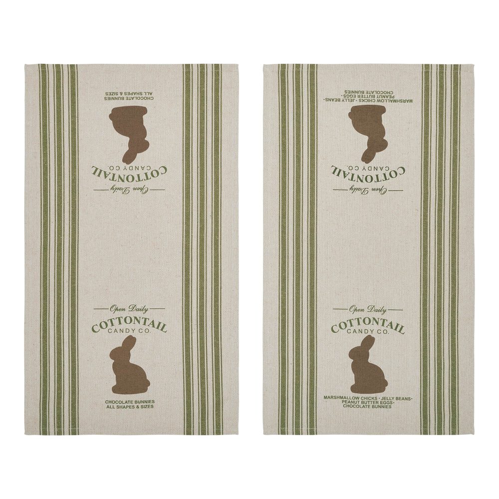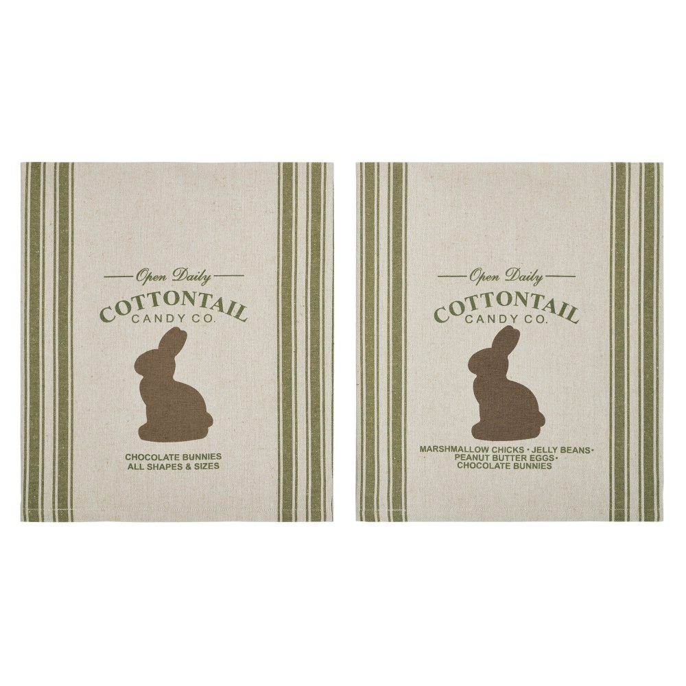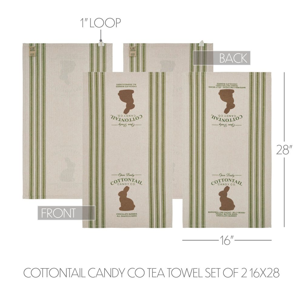 - Charming Vintage Graphics: Each towel features a nostalgic print of a sitting chocolate bunny with the text “Open Daily, Cottontail Candy Co. Marshmallow Chicks + Jelly Beans + Peanut Butter Eggs + Chocolate Bunnies”, evoking the whimsy of a vintage country candy store.