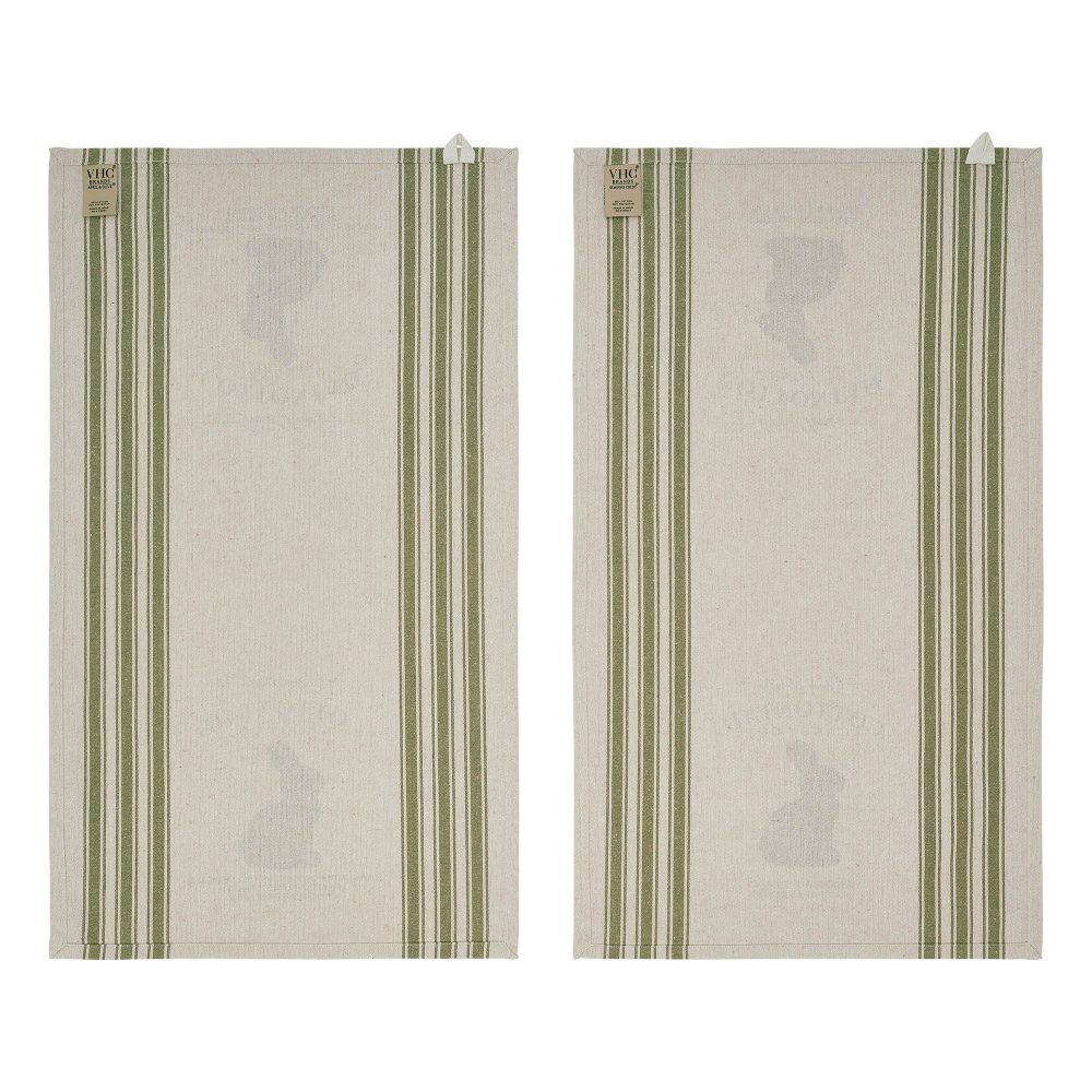 Add a whimsical touch to your kitchen or dining room decor this spring with the VHC Brands Bunny Hop Cottontail Candy Co Tea Towel Set of 2. Each towel measures 16x28 inches and features an adorable vintage-inspired design. A sitting chocolate bunny graphic takes center stage, announcing "Open Daily, Cottontail Candy Co. Marshmallow Chicks + Jelly Beans + Peanut Butter Eggs + Chocolate Bunnies," all set against a light creme backdrop. The playful message is framed with stripes in a subtle sage green, perfectly capturing the essence of a vintage country candy store. These tea towels are crafted from a high-quality blend of cotton and polyester, ensuring durability and softness for daily use. Whether you're drying dishes, handling hot pots, or simply using them as decorative accents, these towels offer both functionality and a charming farmhouse flair. The soothing color palette of light creme, sage green, and chocolate brown easily complements both modern and traditional kitchen interiors, enhancing the festive spirit of spring and Easter with a nod to nostalgic candy shop aesthetics. Caring for the Bunny Hop Cottontail Candy Co Tea Towel Set is effortless, as they are machine washable for convenient maintenance. This easy care ensures that the towels remain vibrant and fresh, ready to be used year after year as a part of your springtime kitchen decor. Perfect for gifting or keeping for yourself, these towels are a delightful addition to any home, bringing a touch of sweetness and style to your daily routines and seasonal celebrations.
