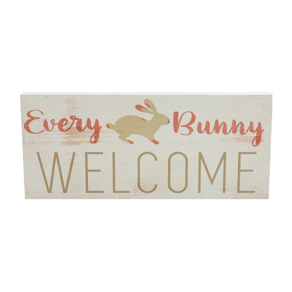- Charming Design: Features a hopping bunny splattered with orange paint on a creme burlap print background, with “Every Bunny WELCOME” in vibrant orange and tan.