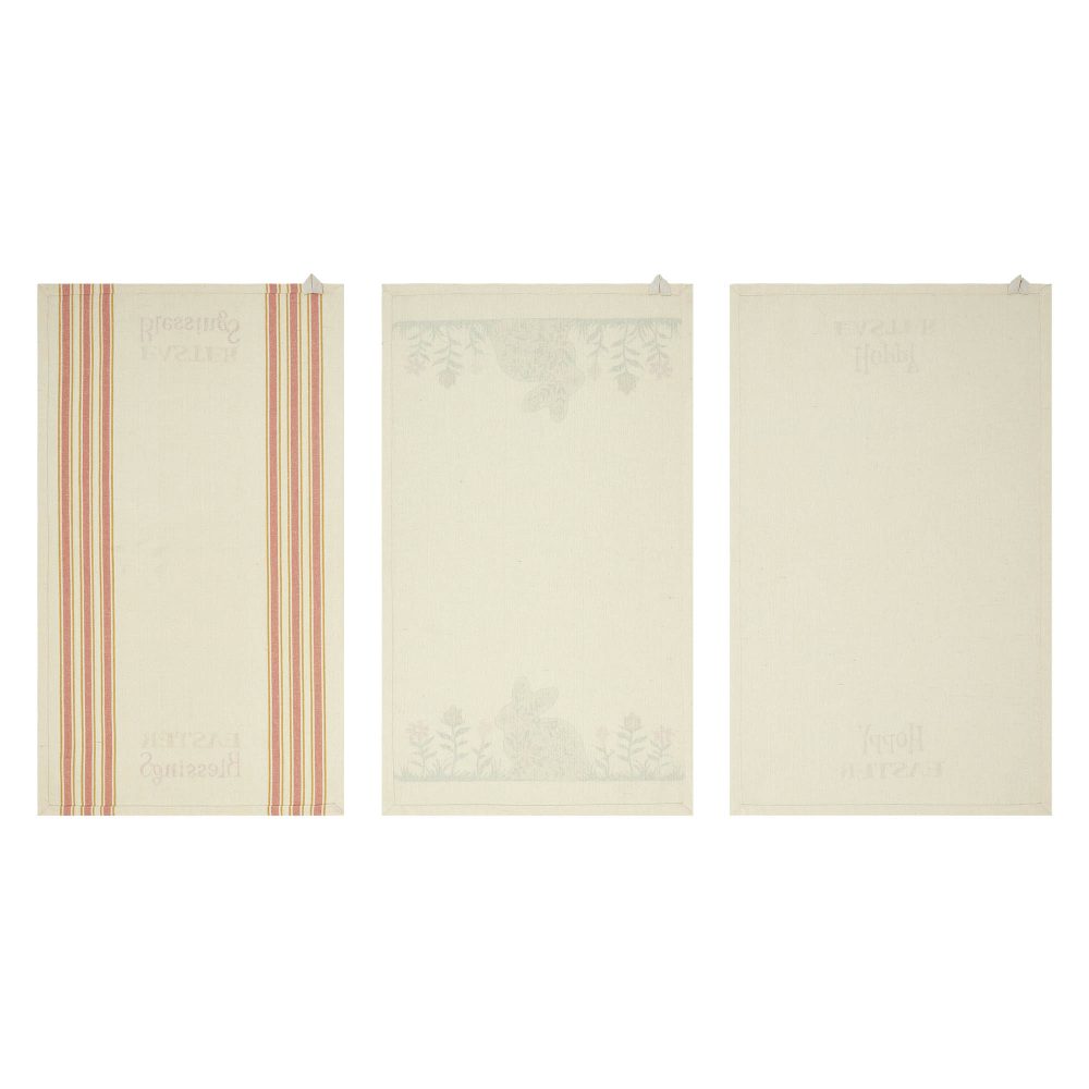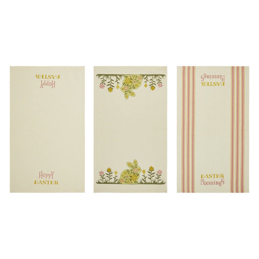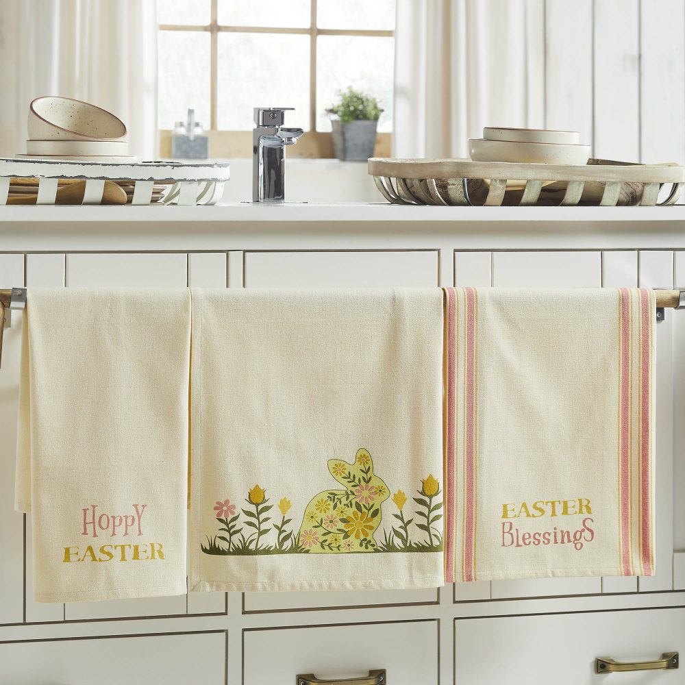 The VHC Brands Bunny Hop Floral Bunny & Easter Tea Towel Set of 3 is a delightful addition to your kitchen or bathroom, perfectly capturing the essence of the Easter season. These 16x28 inch tea towels are crafted from a durable blend of cotton and polyester, ensuring they are as functional as they are decorative. One towel features a vibrant Floral Bunny design in bright yellow and green, while the other two towels complement this cheerful motif with "Hoppy Easter" and "Easter Blessings" messages printed in soft pink and yellow tones on a light cream background. These towels blend seamlessly into both farmhouse and country decor styles, with their pastel color palette and charming Easter-themed prints. They are ideal for everyday use around the kitchen or as a seasonal decoration in the bathroom, adding a touch of springtime joy wherever they are displayed. The vivid colors and festive designs make them an eye-catching addition to any space, enhancing the holiday atmosphere with their playful and heartwarming themes. Caring for the Bunny Hop Floral Bunny & Easter Tea Towel Set is straightforward, as they are machine washable for easy maintenance. This convenient feature ensures that the towels can withstand the rigors of daily use while retaining their beautiful prints and vibrant colors. Whether drying dishes, handling hot pans, or simply hanging on a rack to add a decorative touch, these tea towels serve as a functional and festive accent for any home celebrating the joy of Easter.