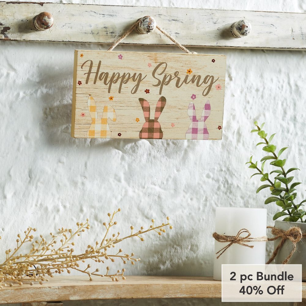 - Sku – 88505 – Bunny Hop Happy Spring 3 Bunnies In Check MDF Wall Sign w/ Twine 5x9x0.75 (2 Packages)