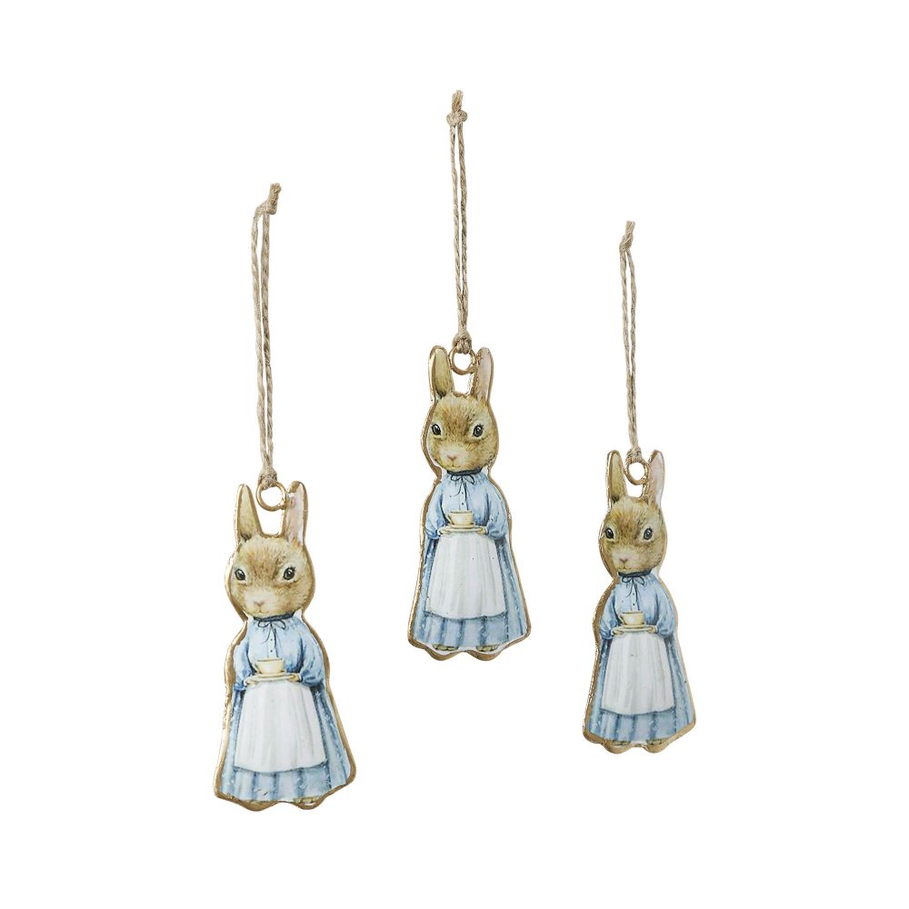 - Charming Spring Design: This set of three metal ornaments features a rural bunny wearing a pale blue dress and apron, gracefully holding a cup and saucer, adding a delightful touch to your spring and Easter decor.