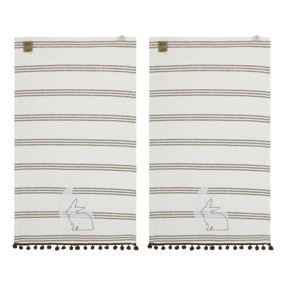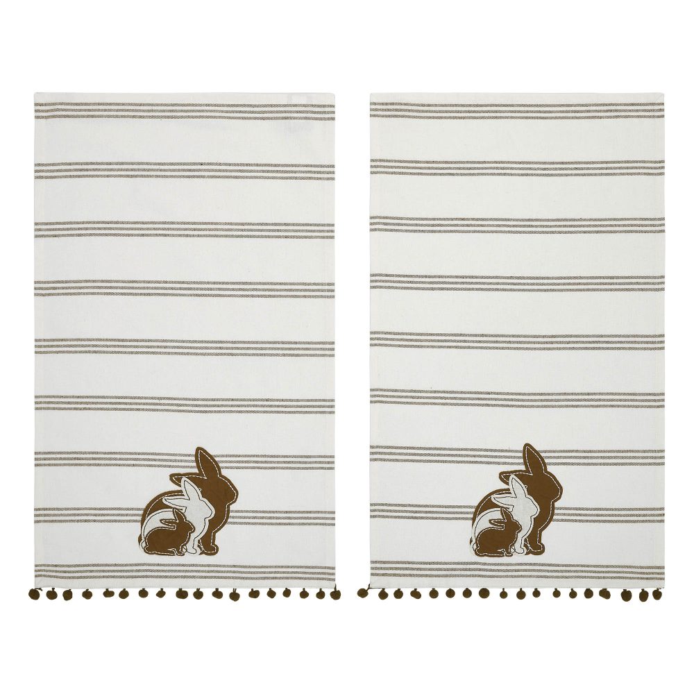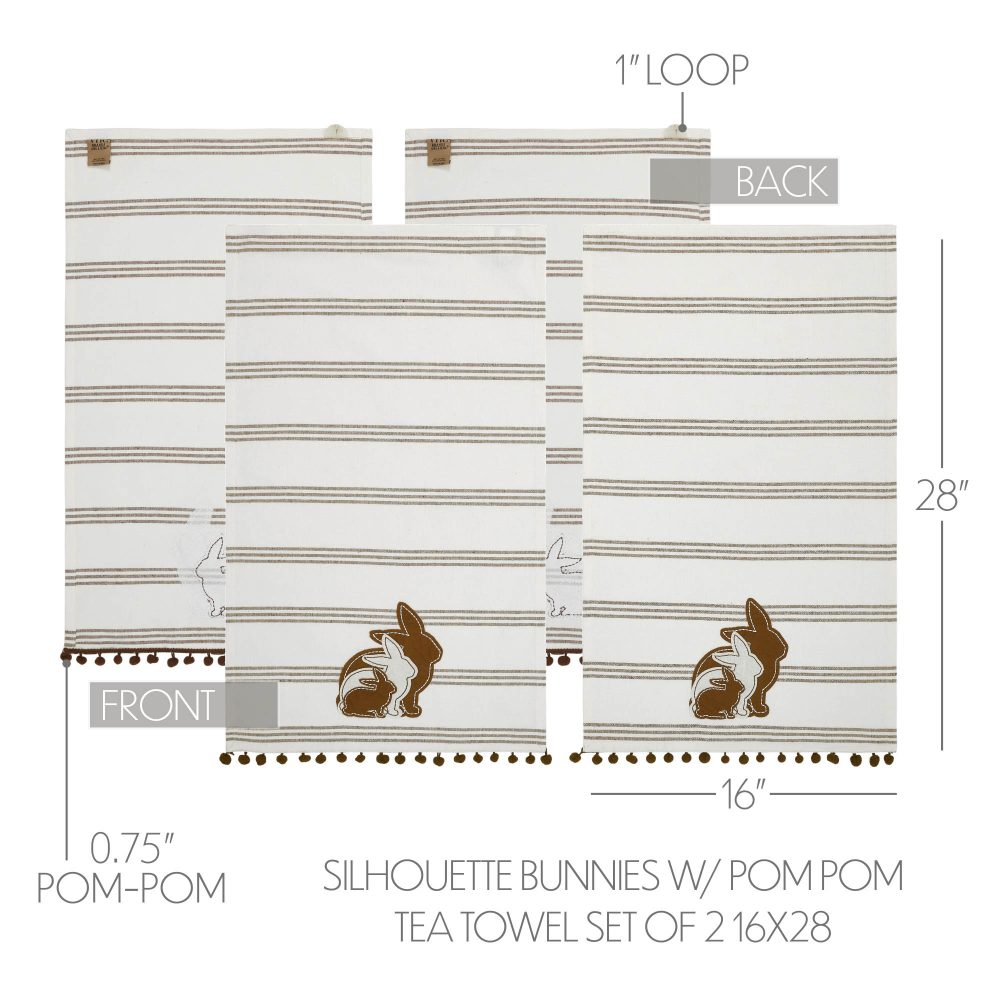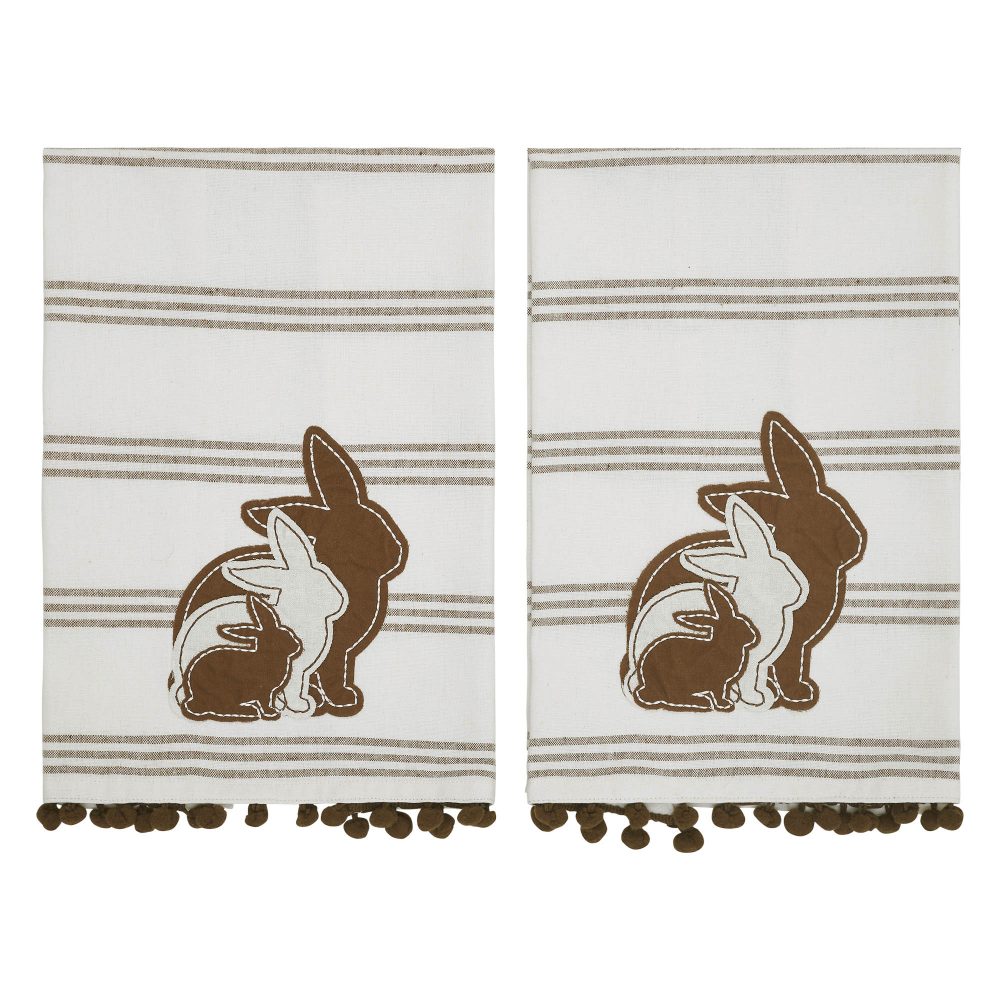 The VHC Brands Bunny Hop Silhouette Bunnies w/ Pom Poms Tea Towel Set of 2 is a charming addition to any kitchen or bathroom this spring season. Made from a blend of cotton and polyester, these 16x28 inch tea towels are both durable and soft. Each towel showcases three appliqued bunny silhouettes in cream and brown, playfully positioned at the base. The bunnies are set against a background of chocolate brown stripes, and the design is finished with a fun tassel trim, enhancing the festive, country farmhouse vibe. These towels are perfect for a variety of uses around the home. Whether you're drying dishes, handling hot pans, or simply displaying them as decorative accents, they bring a warm, springtime feel to the environment. The antique white and chocolate brown color scheme blends easily with existing decor, providing a subtle yet festive backdrop that complements any room's aesthetic. The Bunny Family & Stripes theme adds a touch of whimsy and rustic charm to your home, making these towels a delightful presence in any kitchen or dining area. Maintaining the Bunny Hop Silhouette Bunnies tea towels is straightforward, as they are machine washable for easy care. This feature ensures that the towels can withstand regular use while retaining their appeal and functionality. Perfect for everyday use or as a seasonal decoration, these tea towels make an excellent addition to your spring and Easter decorations, offering both style and practicality. Whether you're updating your own home or looking for a thoughtful gift, these tea towels are sure to please.