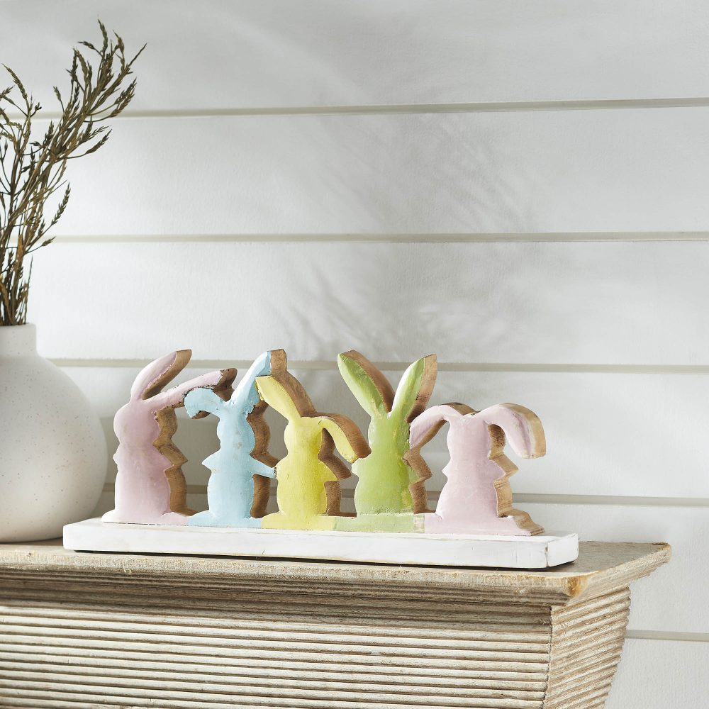 Celebrate spring with timeless charm. The Bunny Hop Wooden Bunny Silhouette Shelf Sitter features five charming rabbits carved in a continuous line from natural wood, lightly distressed in a soft white finish for a rustic look that feels both nostalgic and fresh. Sized to perch easily on shelves, mantels, or tiered trays, this freestanding piece offers flexibility for home decorators and visual merchandisers alike. Whether used as a farmhouse Easter focal point or styled year-round in neutral decor palettes, this artisan-crafted piece brings warmth and seasonal spirit to any setting. Pairs effortlessly with coordinating Bunny Hop accessories for an elevated and cohesive spring assortment.