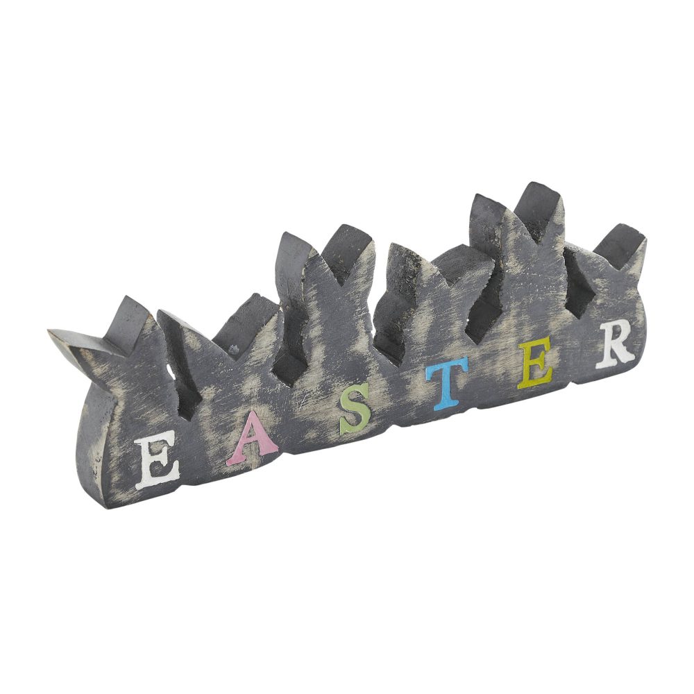 • Spring-Themed Design: Features the word “Easter” carved into tropical wood with each letter represented by a charming bunny silhouette in different spring colors.