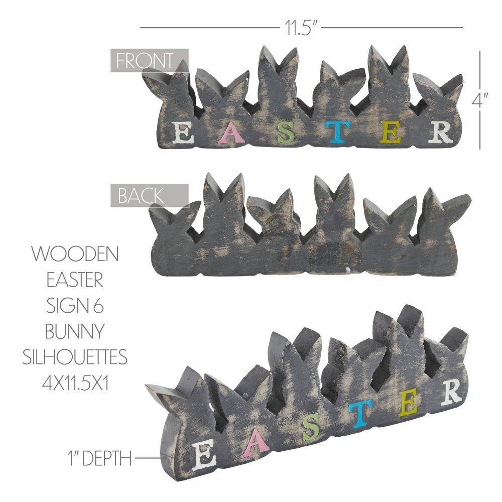 Introducing the VHC Brands Bunny Hop Wooden Easter Sign with 6 Bunny Silhouettes, a charming and festive addition to your spring and Easter decor. This delightful piece measures 4x11.5 inches and is crafted from tropical wood, featuring six bunny silhouettes that spell out the word "Easter" in various spring colors. Each bunny represents a different letter, creating a playful and whimsical display. The bunnies are painted in soft shades of charcoal grey, soft white, and pale pink, adding a touch of rustic charm to your home. Perfect for enhancing your farmhouse or primitive decor, the Bunny Hop Wooden Easter Sign brings a joyful and welcoming atmosphere to any room. Whether displayed in the dining room, entryway, living room, or even the kitchen, this sign captures the essence of Easter with its charming design and vibrant color block. The painted and carved graphic details highlight the craftsmanship and attention to detail, making this piece a standout addition to your seasonal decorations. The sign's rustic aesthetic and soft color palette make it a versatile choice that complements a variety of decor styles. Designed for durability and easy maintenance, the Easter sign can be wiped clean with a soft cloth, ensuring it remains a cherished part of your decor for years to come. Perfect for adding a festive touch to your bathroom, bedroom, or any living space, the VHC Brands Bunny Hop Wooden Easter Sign with 6 Bunny Silhouettes is a delightful and stylish addition. Celebrate the joy of Easter and the beauty of spring with this beautifully crafted sign, bringing warmth and charm to your home.