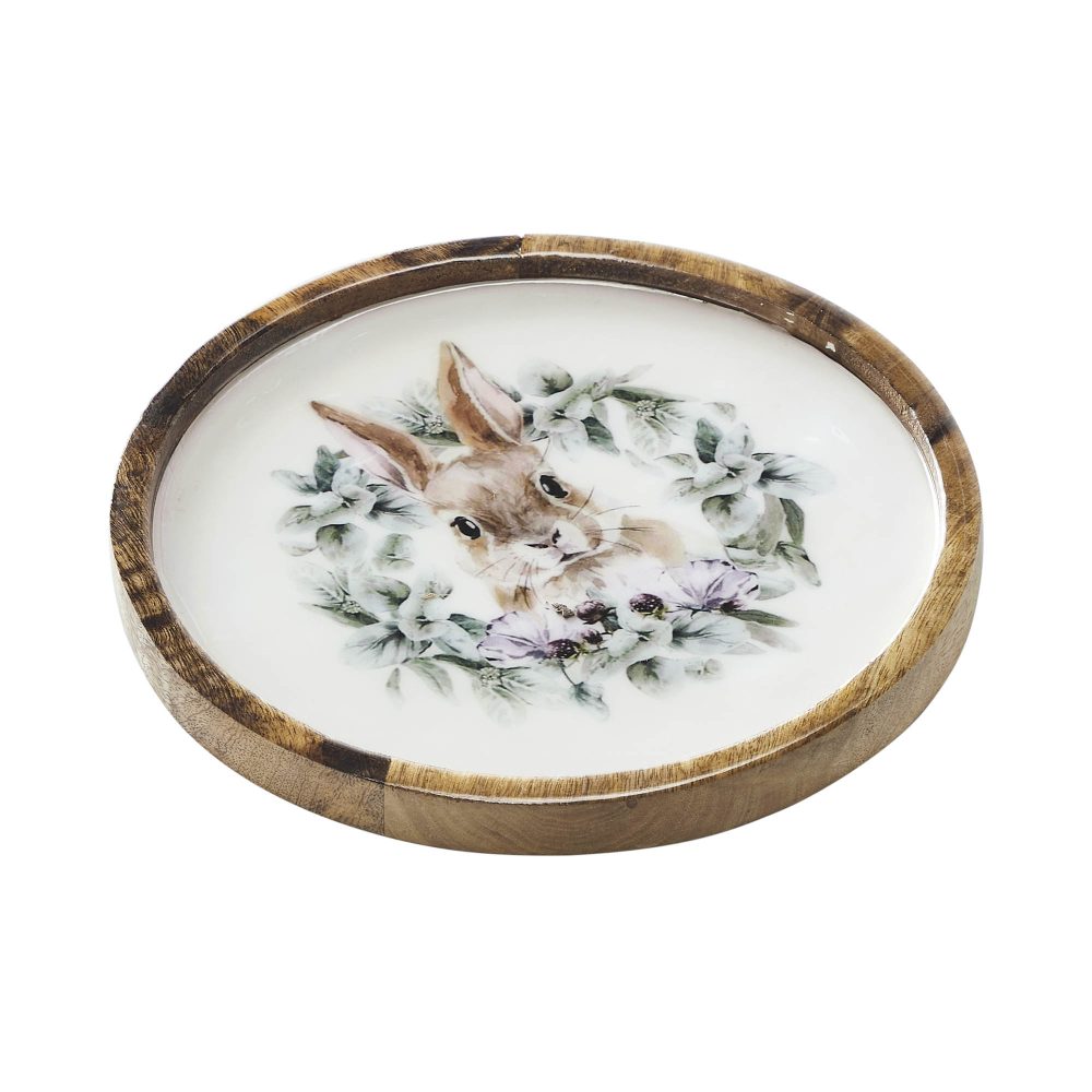 Introducing the VHC Brands Bunny Hop Wooden Plate with Bunny & Wreath, a charming and elegant addition to your spring and Easter decor. Measuring 10x10 inches, this beautifully crafted wooden plate is made from tropical wood, offering a natural and sturdy feel. The plate features an enamel overlay and a printed brown bunny at its center, surrounded by a delicate wreath of flowers, creating a serene scene against a bright white background. The combination of acorn brown, bright white, and sage green colors adds a fresh and inviting touch, perfect for celebrating the season. Ideal for enhancing your farmhouse or country-style decor, the Bunny Hop Wooden Plate brings a warm and welcoming atmosphere to any room. Whether displayed as a centerpiece on a dining table, as an accent piece in the kitchen, or as a decorative element in the living room, this plate captures the essence of spring with its nature-inspired design. The intricate detailing of the bunny and floral wreath, along with the round shape, showcases the craftsmanship and attention to detail, making this piece a standout in your seasonal decorations. The soft, earthy tones harmonize beautifully with various decor styles, making it a versatile addition to your home. Designed for both beauty and practicality, the plate can be easily wiped clean with a soft cloth, ensuring it remains a cherished part of your decor for years to come. Its timeless design and nature print make it suitable for various uses, from a decorative plate to a wall-mounted display. Embrace the beauty and tranquility of spring with the VHC Brands Bunny Hop Wooden Plate with Bunny & Wreath, a delightful and heartwarming piece that brings the joy of the season into your home, perfect for adding a touch of nature and elegance to any space.