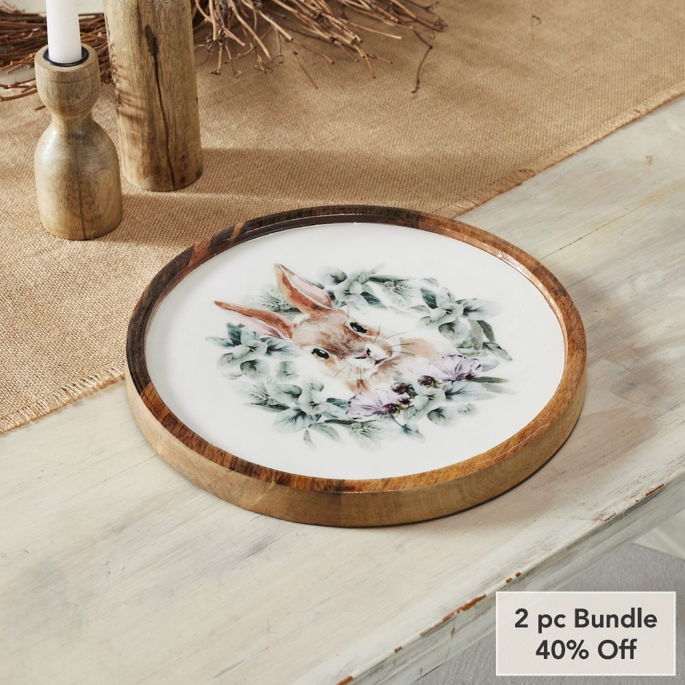 - Sku – 88474 – Bunny Hop Wooden Plate Natural w/ Bunny & Wreath 11.5 inch Diameter (2 Packages)