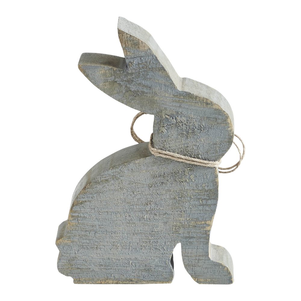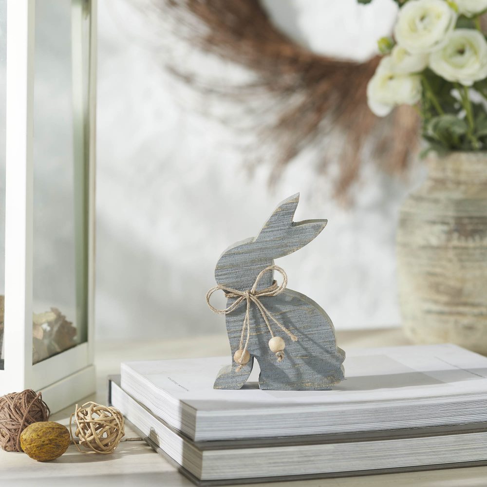 Celebrate subtlety with charm. This greywashed wooden bunny delivers simple sophistication with its minimal form and warm natural bead collar. Designed to nest easily in tighter displays or alongside larger Bunny Hop pieces, it's the understated seasonal touch that completes farmhouse shelves, modern rustic vignettes, or cottagecore nooks. A merchandising-friendly option that appeals to neutral trend shoppers.