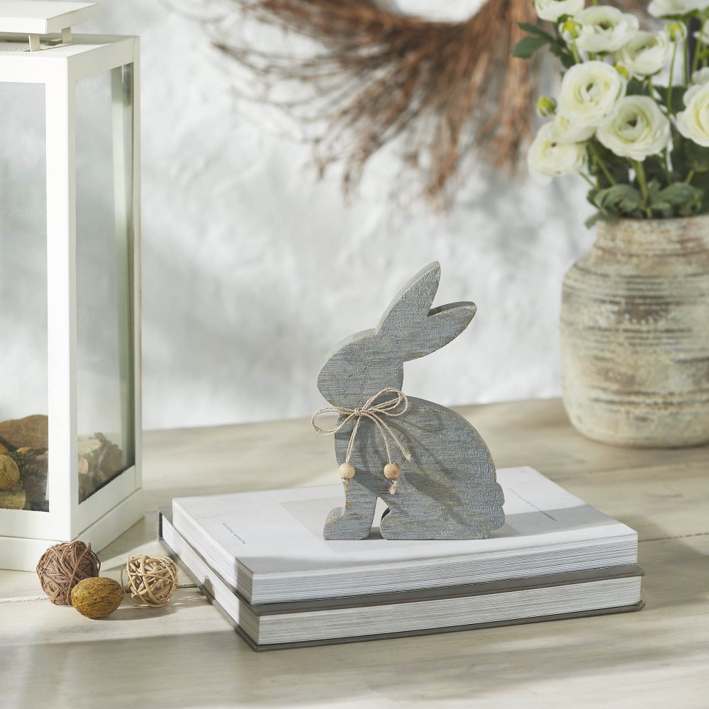- Elegant Design: Features a distressed storm grey sitting bunny adorned with a jute twine bow and natural wood beads, adding a touch of rustic charm.