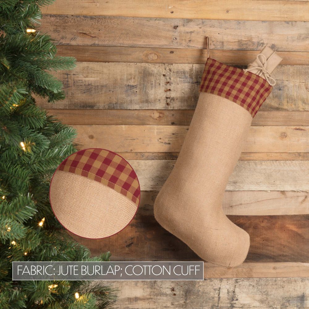 We extended our popular home decor line with holiday cheer in the 12x20 Burgundy Check Jute Stocking. Now you can add this classic Burgundy Check look above your mantel. This stocking features a jute body with turned cuff of burgundy and tan check. Finished with hanging loop lined with flannel and taffeta.