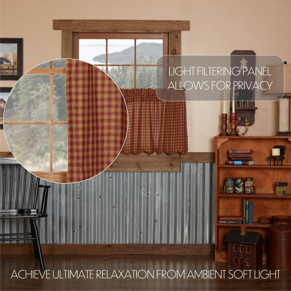 Dark khaki tan and burgundy red checkered plaid add a relaxed, primitive feel to your windows. Our Burgundy Check Scalloped Tier Set measures 24x36 inches and includes a softly scalloped edge. The rustic country pair of short, tier-style curtains is constructed with 100 percent cotton for easy care and is machine washable and iron safe. The curtains are fully lined with a soft white fabric to offer increased protection from the sun and fading. Includes a 3.25 inch rod pocket for easy hanging.