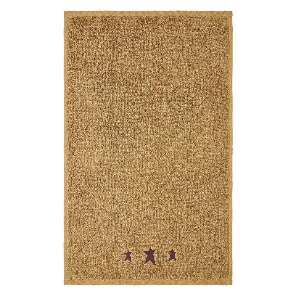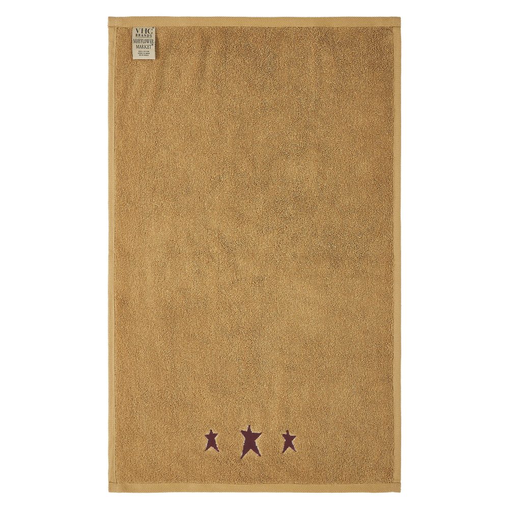 Add a cozy, rustic touch to your bathroom with the VHC Brands Burgundy Prim Stars Tan Hand Towel Set of 2. Crafted from soft and absorbent cotton terrycloth, these towels are perfect for everyday use, offering both functionality and style. The neutral doe tan color serves as a warm base, while the embroidered primitive stars in deep burgundy at the bottom give the towels a charming, country-inspired look. Each towel measures 16x26 inches, making them an ideal size for hanging on a towel bar or by the sink. The three embroidered stars add a subtle yet striking decorative element, perfect for enhancing a primitive or rustic washroom. These towels are machine washable, ensuring they remain soft and absorbent, even with frequent use. The VHC Brands Burgundy Prim Stars Tan Hand Towel Set blends primitive charm with modern convenience. Whether you're looking to elevate the look of your bathroom or simply need a functional yet decorative hand towel, this set brings a timeless, rustic flair to your space while offering everyday practicality.