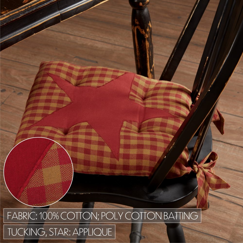 Get the style of burgundy and dark tan checked plaid and primitive star applique with the comfort of a traditional kitchen seat cushion. The Burgundy Star Chair Pad is a durable 14 by 14 inch square chair cushion with long ties to easily add a pop of primitive country charm to a wide variety of seating. This vintage farmhouse seat pad features a durable cotton shell with a large star accent in deep burgundy and poly-cotton batting for durable, long-lasting style while offering your chairs protection from damage. Spot clean as needed. To give your kitchen or tabletop a complete look, pair with other items from the Burgundy Star or Burgundy Check Collection including rustic farmhouse placemats, table runners and more.