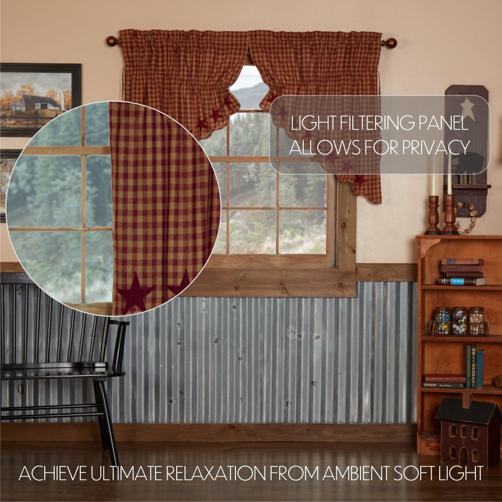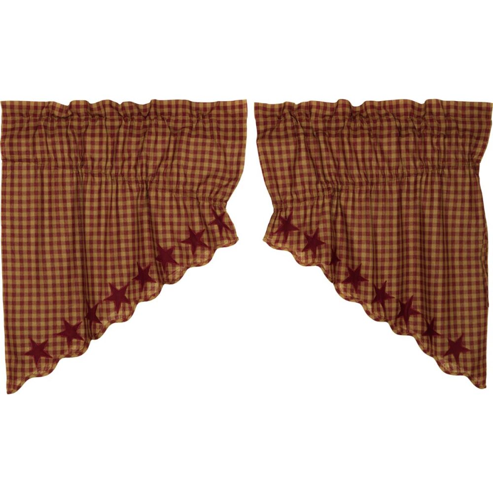 Decorate your windows with a touch of primitive country style with this charmingly designed and thoughtfully crafted window swag set. Displaying a timeless country look with a beautiful burgundy and khaki tan checked plaid base with scalloped edging and applique star accents, the Burgundy Star Scalloped Prairie Swag Set 36x36x18 enhances your home decor with a sophisticated modern primitive feel. The gracefully angled drapes perfectly frame windows providing a bit of polish for your home. Our fully lined prairie swag panels come with built in drawstrings to adjust each panel to meet your style needs, along with a curtain rod pocket for easy hanging. Includes two matching drapes for a perfectly dressed kitchen or living room window.