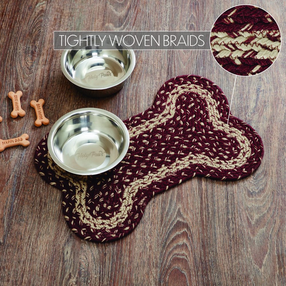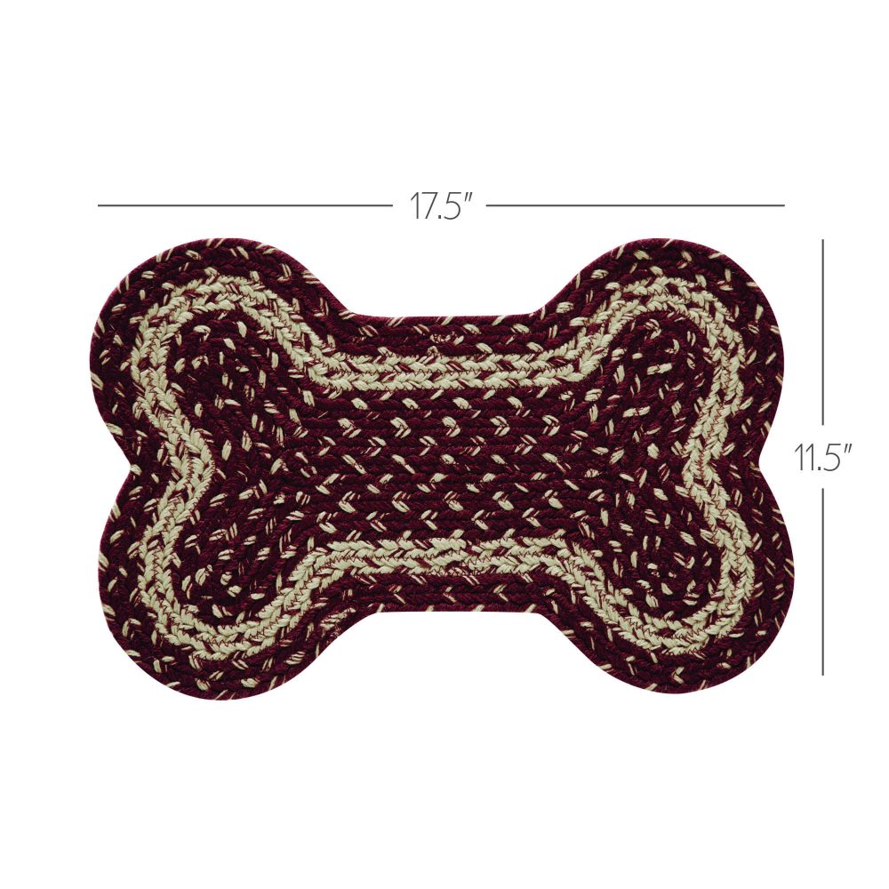 Give your pet a rug that is both stylish and practical. The Burgundy Tan Small Bone Rug measures 11.5x17.5 inches and is crafted with 100% recycled polyester material (PET) making it waterproof and durable. The bone-shaped pet rug is suitable for both indoor and outdoor use and is the perfect home for water and food bowls for small breed dogs. The deep, primitive country tones of burgundy red and natural tan make this a great choice for classic country or vintage farmhouse looks.