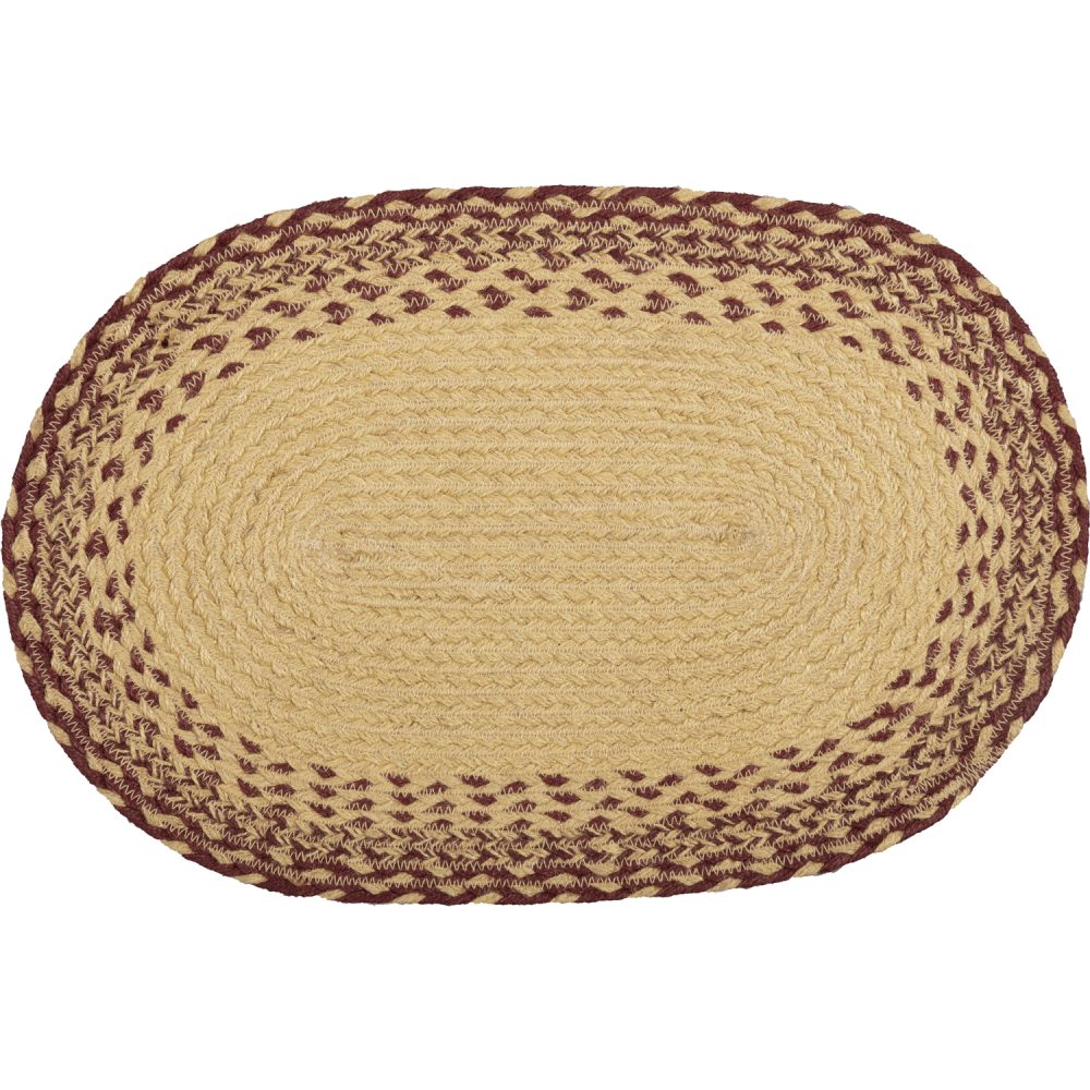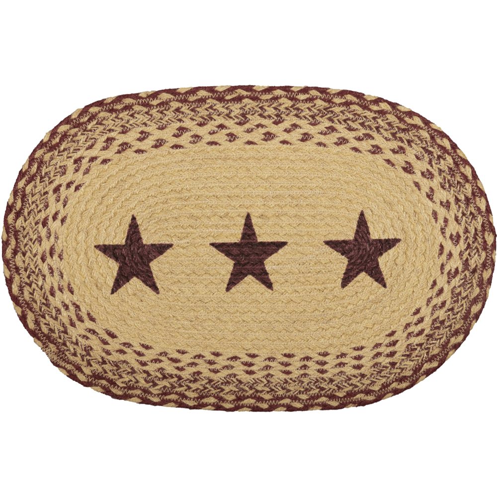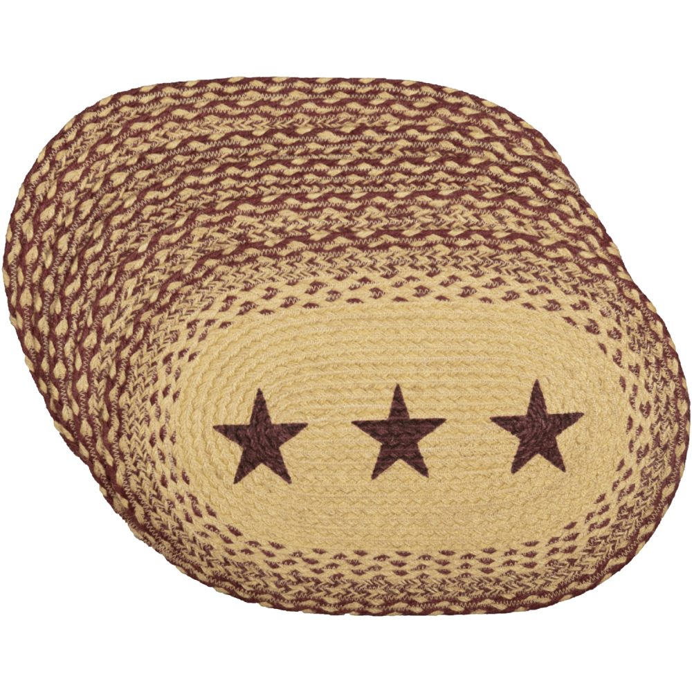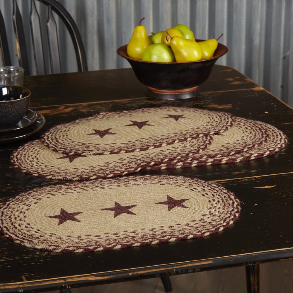 Create a joyful table for friends and family to gather round with traditional country colors and classic texture. The Burgundy Tan Jute Placemat Stencil Stars Set includes six oval placemats measuring 12x18 inches made from a premium Jute blend. The rich texture of braided jute is given a dash of primitive Americana style with a natural tan base accented by burgundy highlights woven into the outer edges and a central design of stars for simple country style. Complete your tabletop decor with other pieces from the Burgundy Tan Jute Collection by VHC for traditional country farmhouse style.
