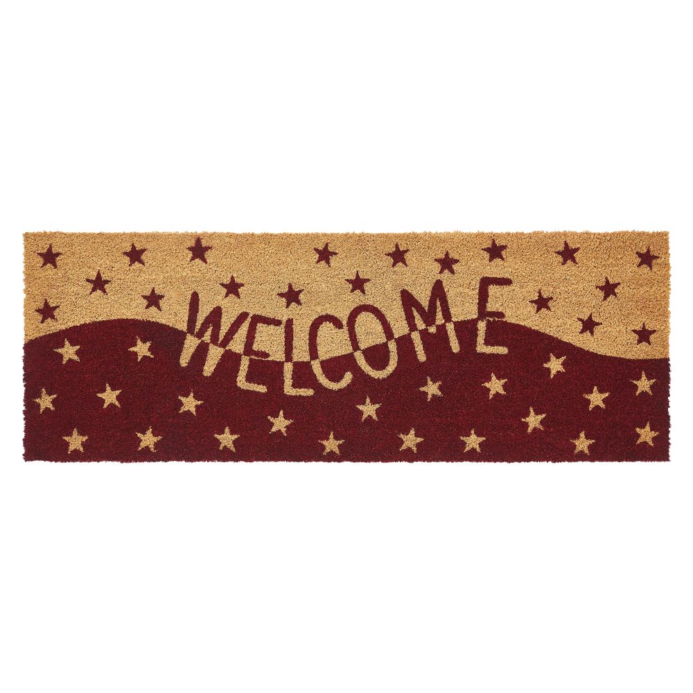 Welcome guests with the inviting charm of the VHC Brands Burgundy Tan Stars Coir Welcome Rug Rect 17x48. This striking two-tone rug features a warm "Welcome" message displayed against a backdrop of rolling hills, surrounded by stenciled stars in rich burgundy and natural tan. Its rustic design adds a cozy touch to any entryway, making it a perfect fit for country or primitive-style homes. Crafted from durable coir, this rug is designed to effectively trap dirt and debris, helping to keep your entryway clean while enhancing your home's decor. The rectangular shape fits seamlessly at your doorstep, while the non-slip PVC backing ensures stability, preventing slips and keeping the mat securely in place in high-traffic areas. The combination of vibrant colors and charming imagery creates a welcoming atmosphere that resonates with warmth. For easy maintenance, simply shake or vacuum the rug to remove surface dirt. To preserve its bright colors and extend its life, it's best to keep the VHC Brands Burgundy Tan Stars Coir Welcome Rug in a sheltered entryway. Combining practical functionality with rustic beauty, this rug is an essential addition to any home looking to greet visitors with a warm and inviting entrance.