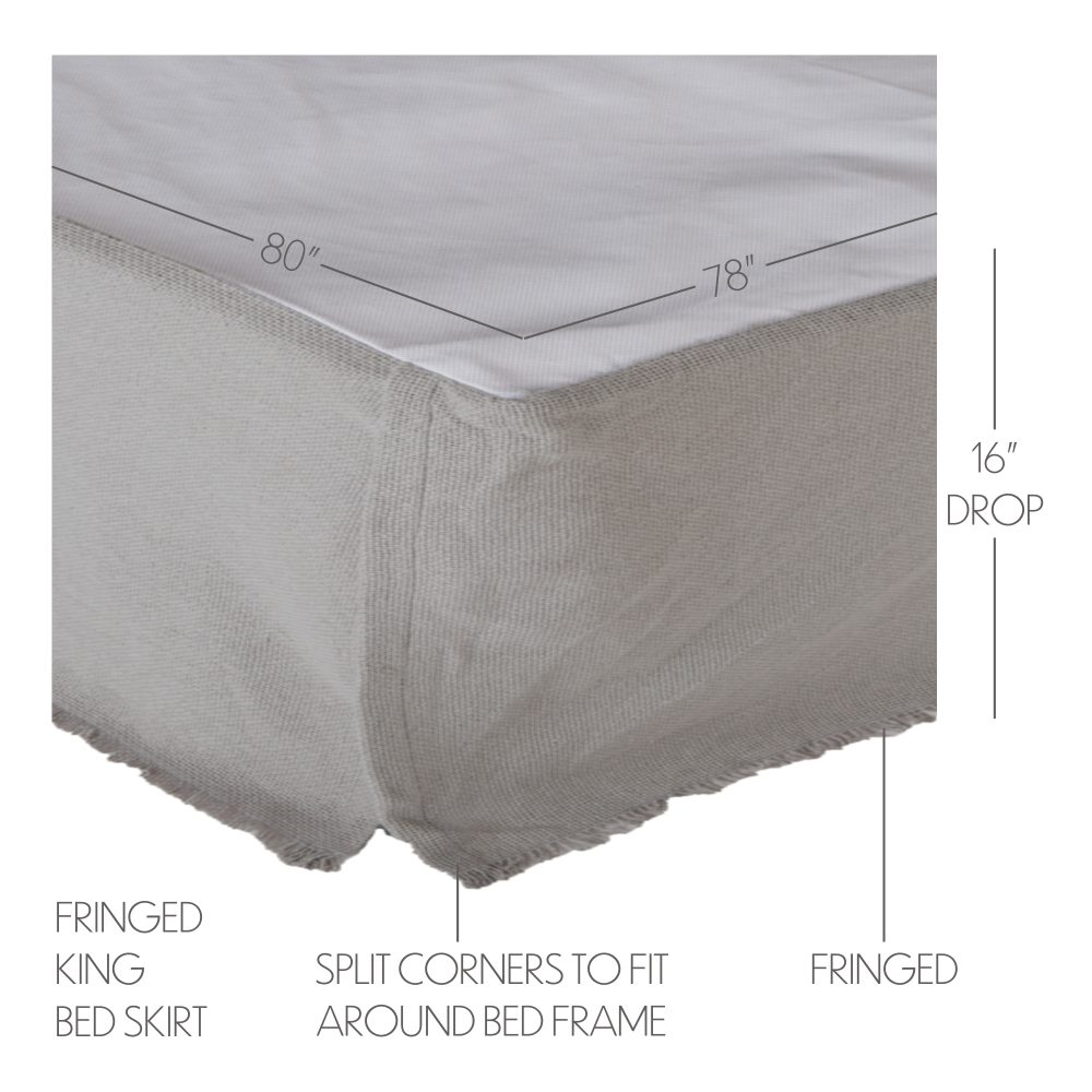 Give your bed a rustic touch with delicate fringe and soft, textured burlap. Our Burlap Dove Grey Fringed King Bedskirt features dove grey cotton burlap for a modern farmhouse feel. This 78x80-inch burlap dust ruffle is both practical and stylish. It includes a split corner design to make corners a snap. A tailored design and delicate fringed edging provide an easy way to add put-together charm to your bed while the long 16-inch drop makes sure your under-bed hardware and storage stay hidden from view. For a complete look, pair this cozy bed skirt with our Burlap Dove Grey Shams and Window Treatments. Hand washable and iron safe.