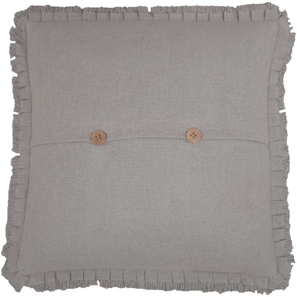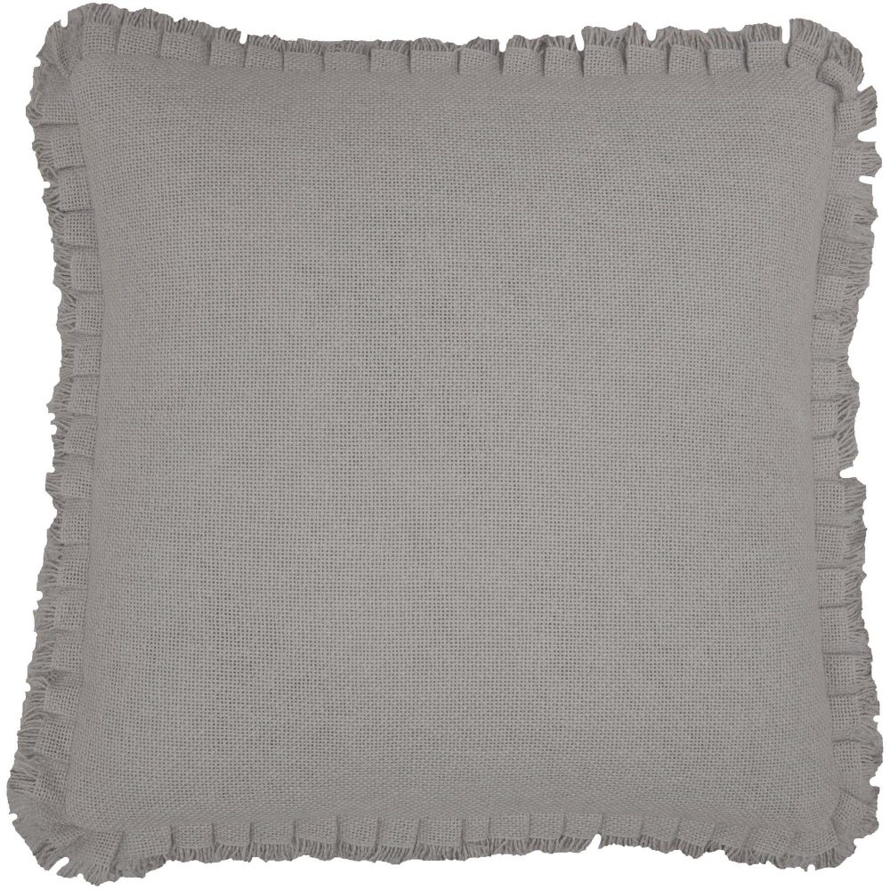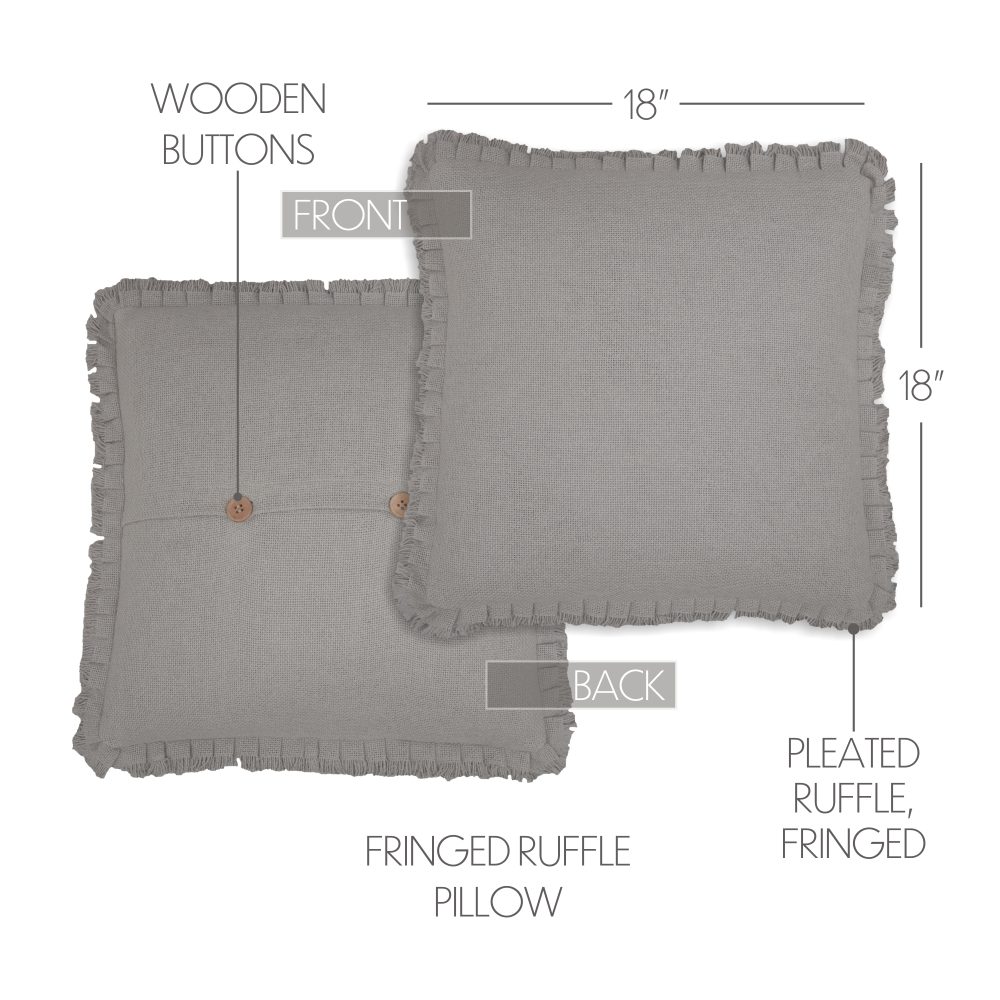 Modern dove grey in a rustic burlap brings the best of primitive charm and modern farmhouse style. The 18x18 inch Burlap Dove Grey Pillow features a sophisticated, pleated ruffle edge with a light fringe. This cozy throw pillow adds a neutral, elegant accent to your living room or bedroom. Features a removable cotton pillow cover with button-style closures and a polyester lining and fill. Coordinates with the Burlap Dove Grey Collection from VHC for accent and foundational pieces in a timeless farmhouse style with the quality you would expect from over 20 years of satisfied customers.
