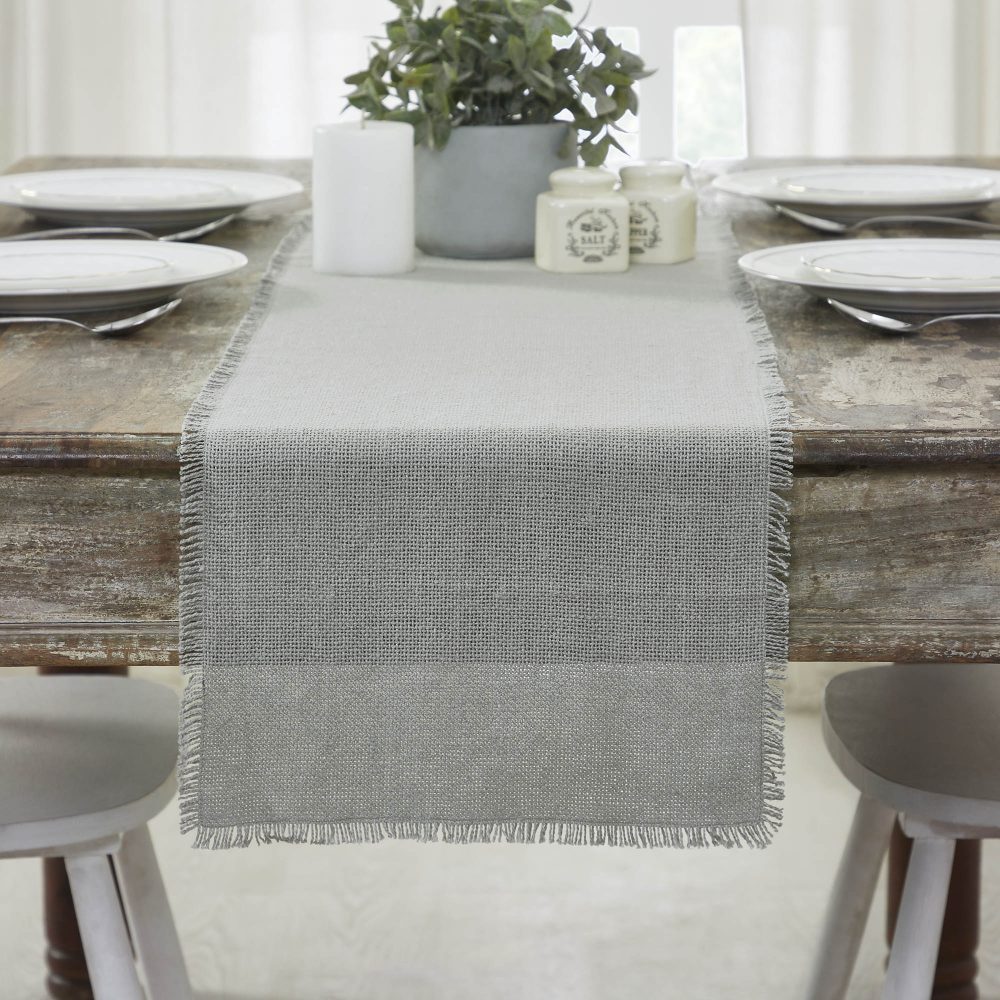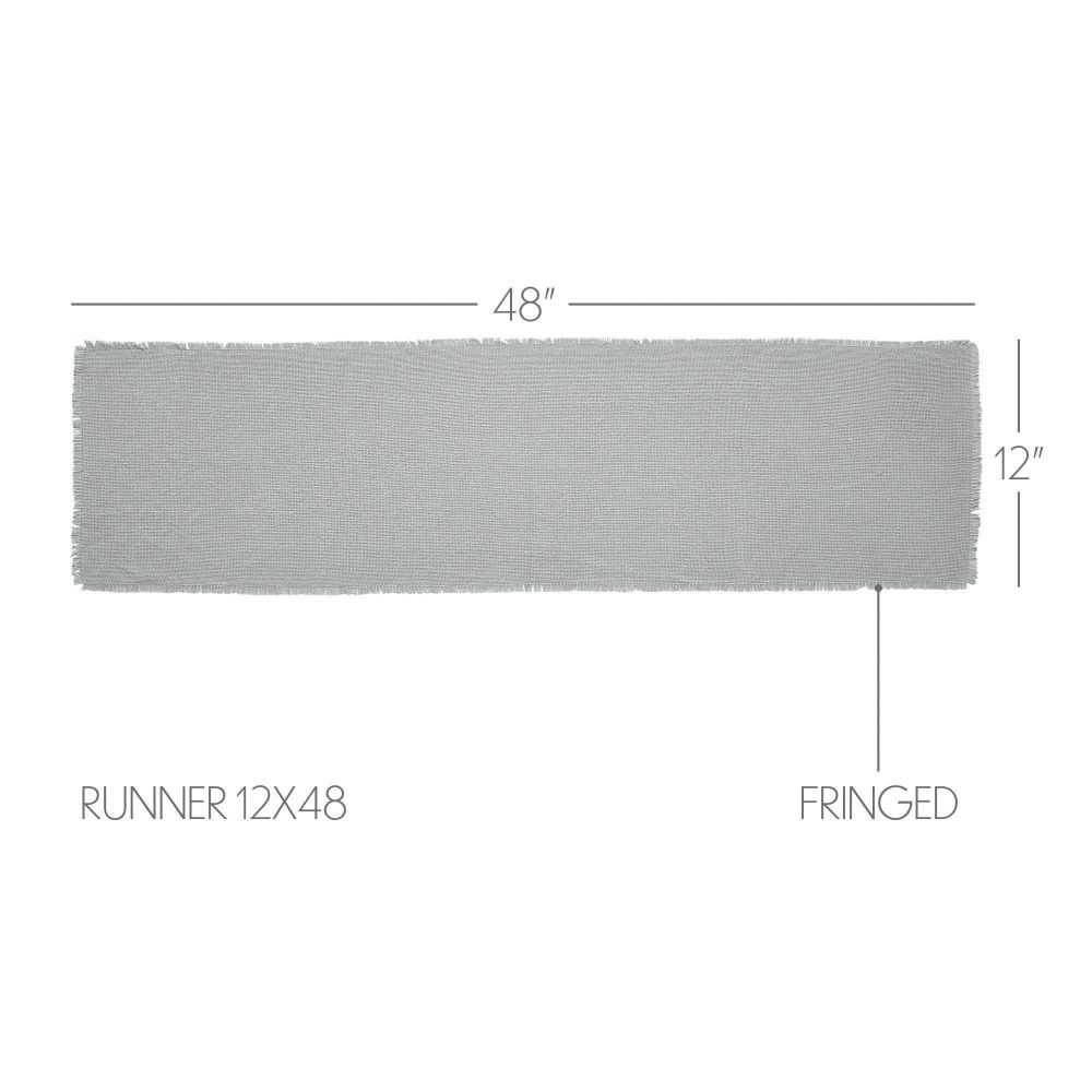 Create a joyful table for friends and family to gather round with modern color and classic texture. The Burlap Dove Grey Table Runner includes one long table overlay measuring 12x48 inches. The rich texture and frayed edging of the burlap is given a modern twist with dove grey color for soft, country chic vibes. Complete your tabletop decor with other pieces from the Burlap Dove Grey Collection by VHC for modern farmhouse style.