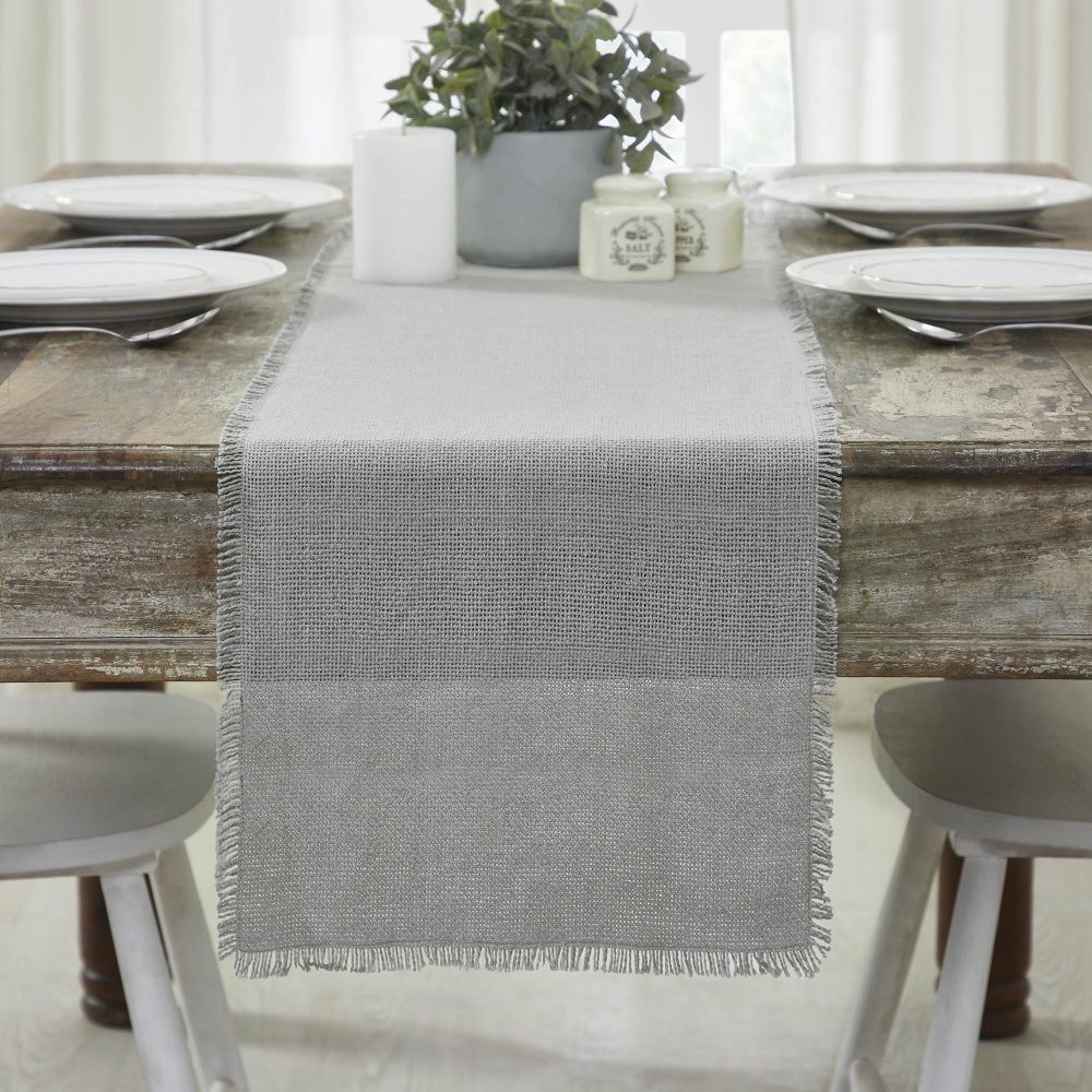 Create a joyful table for friends and family to gather round with modern color and classic texture. The Burlap Dove Grey Table Runner includes one Extra long table overlay measuring 12x72 inches. The rich texture and frayed edging of the burlap is given a modern twist with dove grey color for soft, country chic vibes. Complete your tabletop decor with other pieces from the Burlap Dove Grey Collection by VHC for modern farmhouse style.