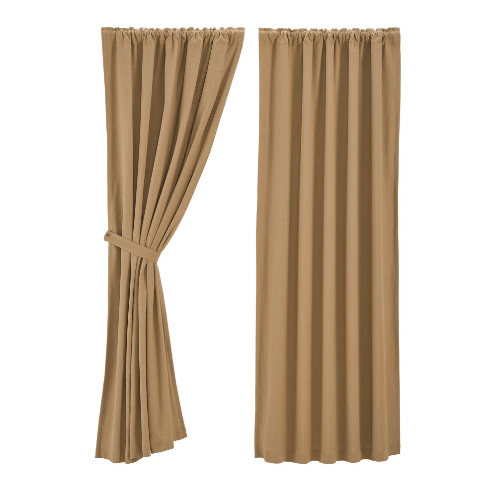 Deep, natural tan burlap creates the perfect accent to your vintage farmhouse window decor. The Burlap Natural Blackout Panel includes a single 84x50 inch cotton window panel with a matching tie back. The room darkening panel includes a blackout lining crafted from 100 percent polyester to add practical benefits without sacrificing style. The panel is easy to hang with a generous 3.25 inch rod pocket with a 2 inch header. Machine washable and iron safe.