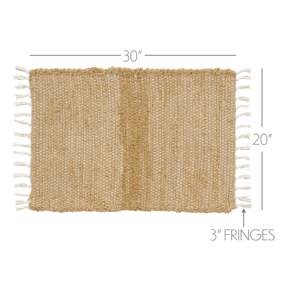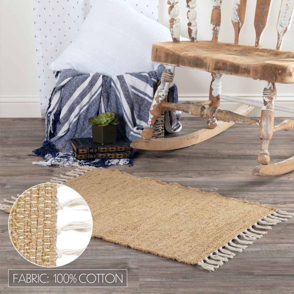 Enhance the look of your home with the rectangle 20x30 Burlap Natural Chindi/Rag Rug. This rug features beautifully colored natural and light tan cotton for a classic farmhouse, country look. Contains a textured, power loom technique and knotted tassels in a farmhouse decor design. Reverses to a tan pattern.