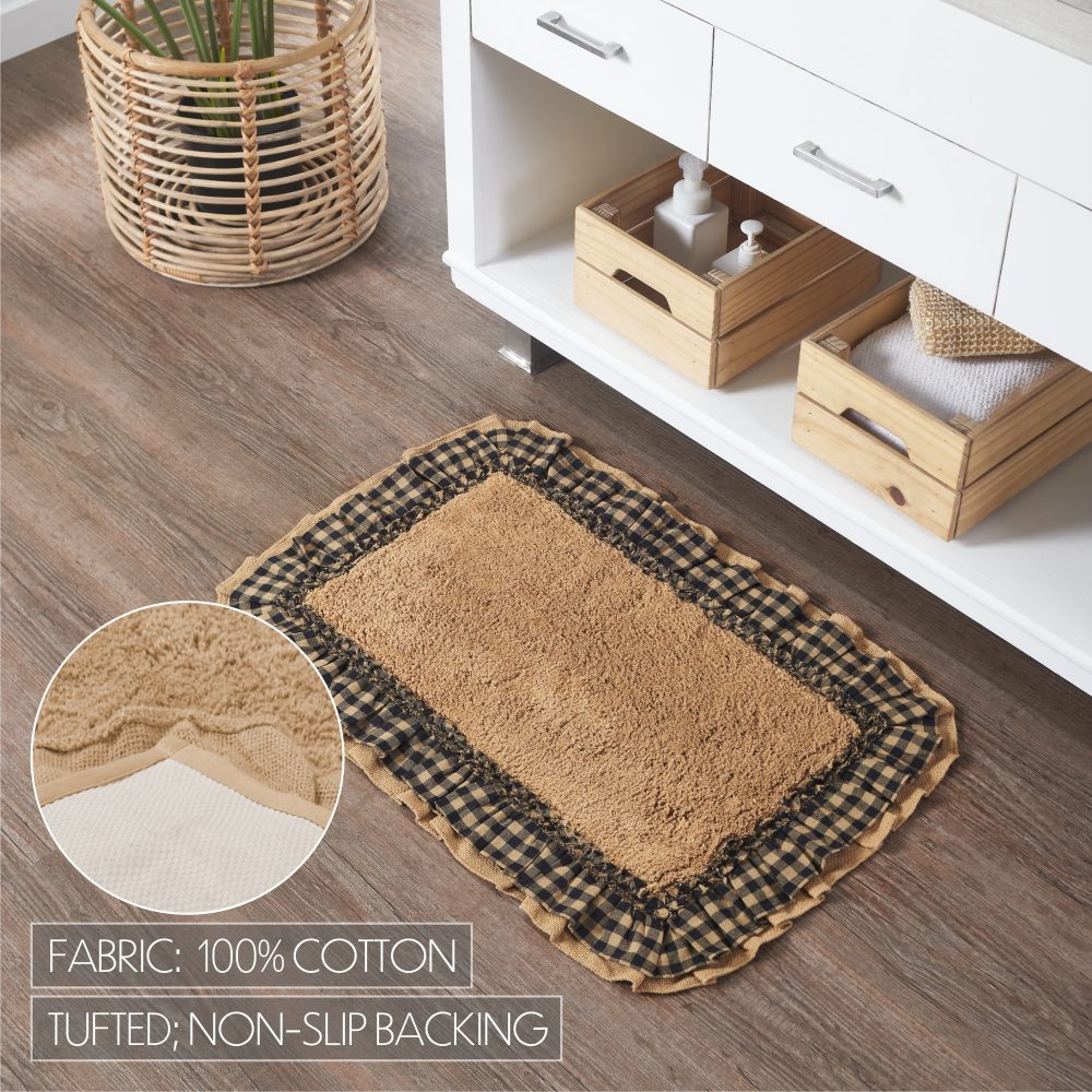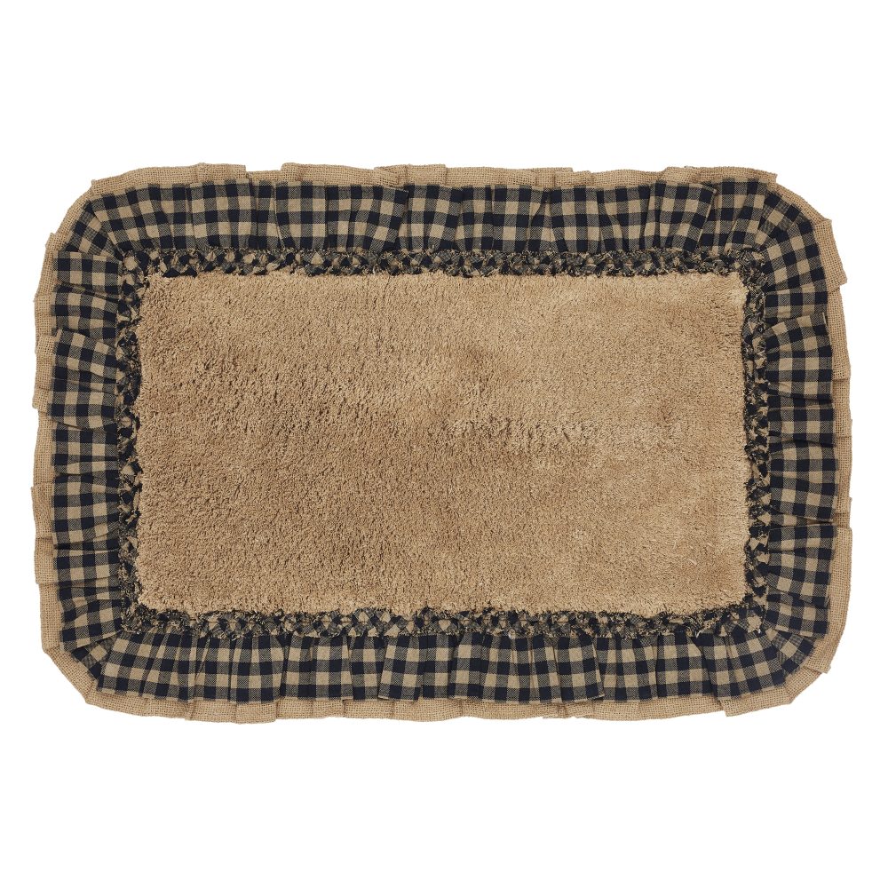 - PREMIUM BATH MAT: A high-quality core provides a thick cushion to sink your feet into and durable cotton to absorb water providing a safe and comfortable post-shower landing. The 20 by 30 inch rug features a ruffled edge in elegant warm tan and black checked burlap.