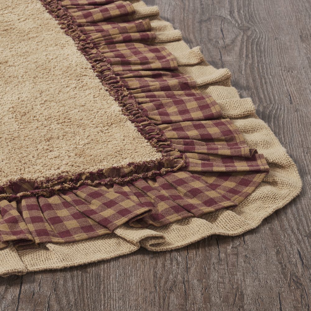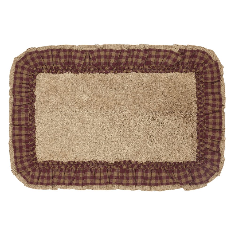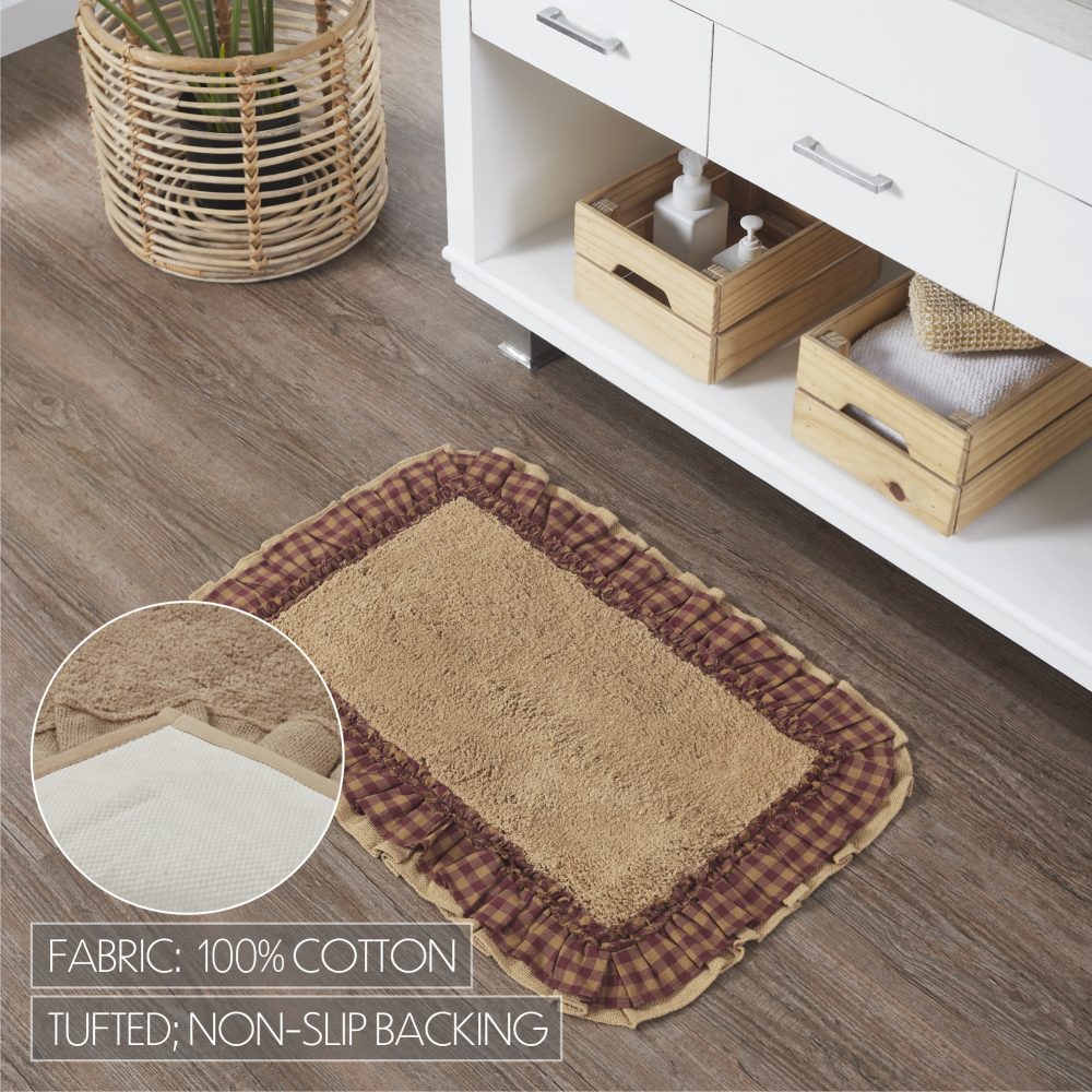 - PREMIUM BATH MAT: A high-quality core provides a thick cushion to sink your feet into and durable cotton to absorb water providing a safe and comfortable post-shower landing. The 20 by 30 inch rug features a ruffled edge in elegant warm tan and burgundy checked burlap.