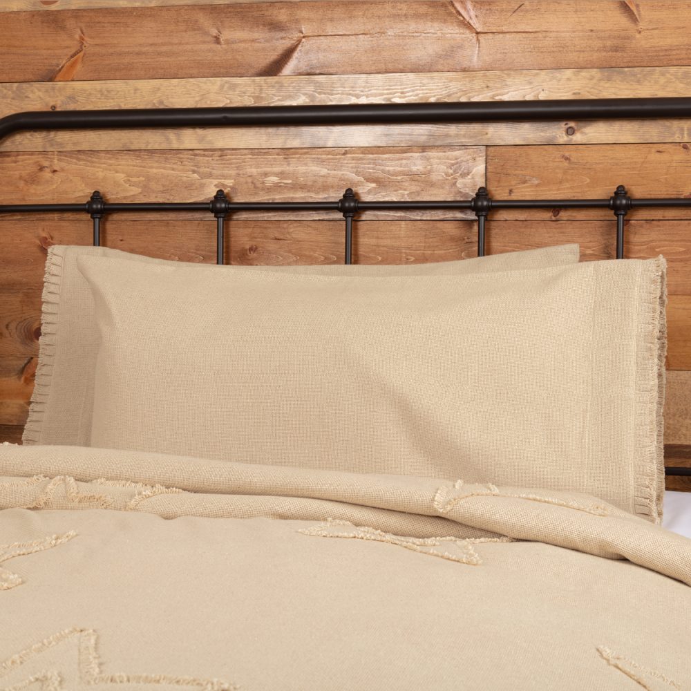 All of the texture without the scratch. Enjoy our unique rustic farmhouse Burlap Vintage King Pillowcase Set 21x40 with Fringed Ruffle. They feature a loose, 100% cotton woven shell with a polyester lining. This cotton burlap is softer than jute for a cozy feel with an vintage tan color with rustic charm. The set features double-sewn seams for extra durability, as well as extra length to ensure good coverage of your fill pillow (not included). A delicate pleated ruffle and soft fringe add a finishing touch to your bedding with a rustic and romantic feel. Coordinates with the Burlap Vintage Collection by VHC for a complete country farmhouse look suitable for a wide range of styles. Hand wash and lay flat to dry to preserve the delicate fringed edging. Iron safe.